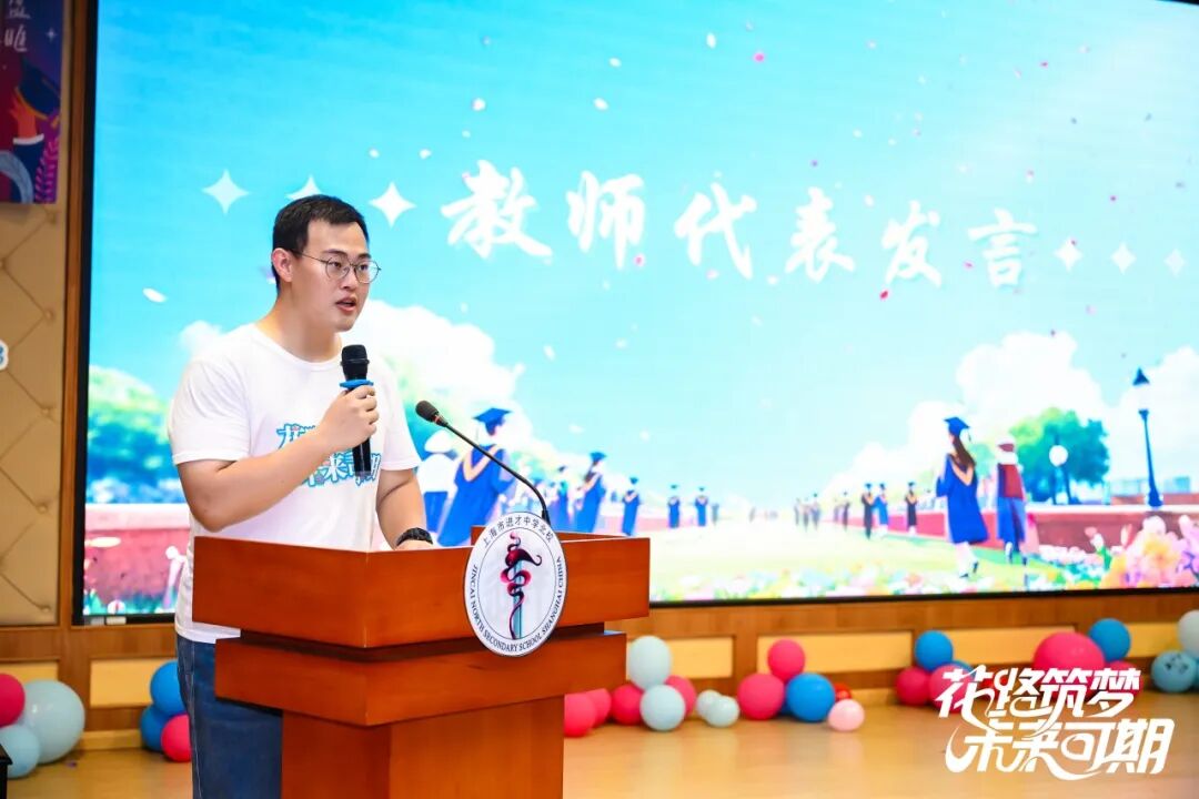 教师代表王麒宇老师回顾了师生相伴的点滴,寄语学子以坚韧、善良与担当迎接未来。