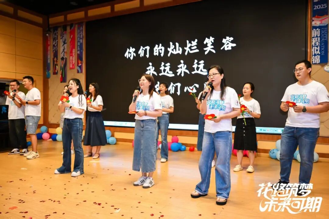 最后,最神秘的教师节目——合唱《送你一朵小红花》温情亮相。初三全体老师将所有祝愿与牵挂倾注于这首歌和一段精心制作的视频里。现场学生们手举红色鲜花,与台上老师心意相连,师生之情在歌声与花海中达到最动人的高潮。