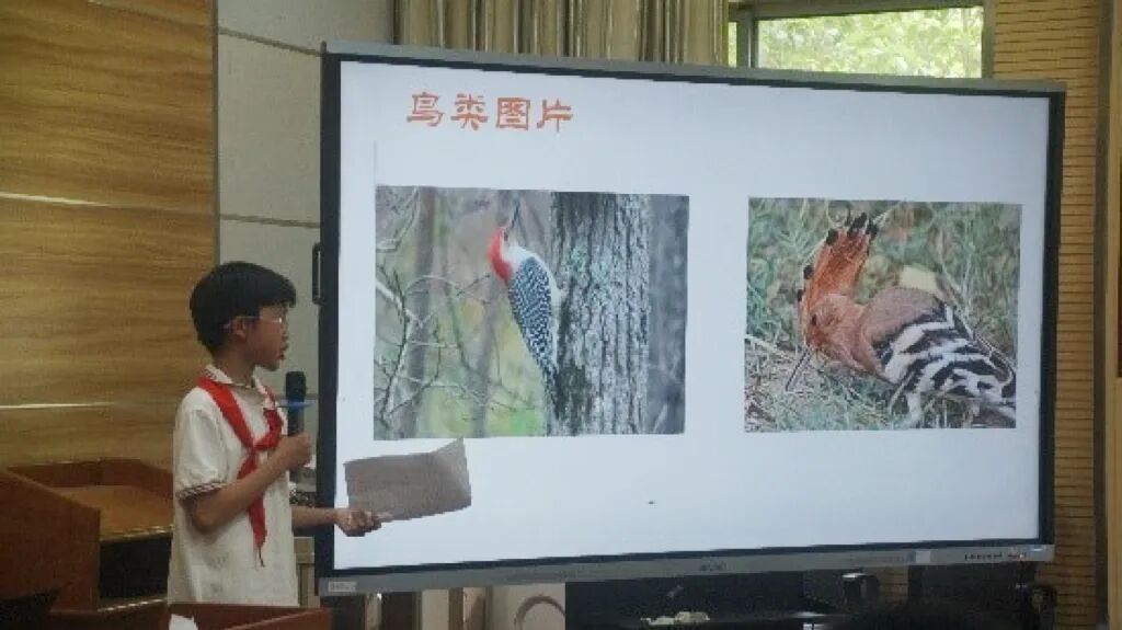戴胜鸟头顶棕栗色羽冠如折扇轻展,细长的喙似天然探针,在吴宇轩同学生动的讲解中,这些林间精灵的习性逐渐鲜活——它们穿梭于草丛间寻觅昆虫,用独特的“哒哒”声标记领地,从新疆广袤的戈壁到江南湿润的稻田,都能窥见它们的身影。