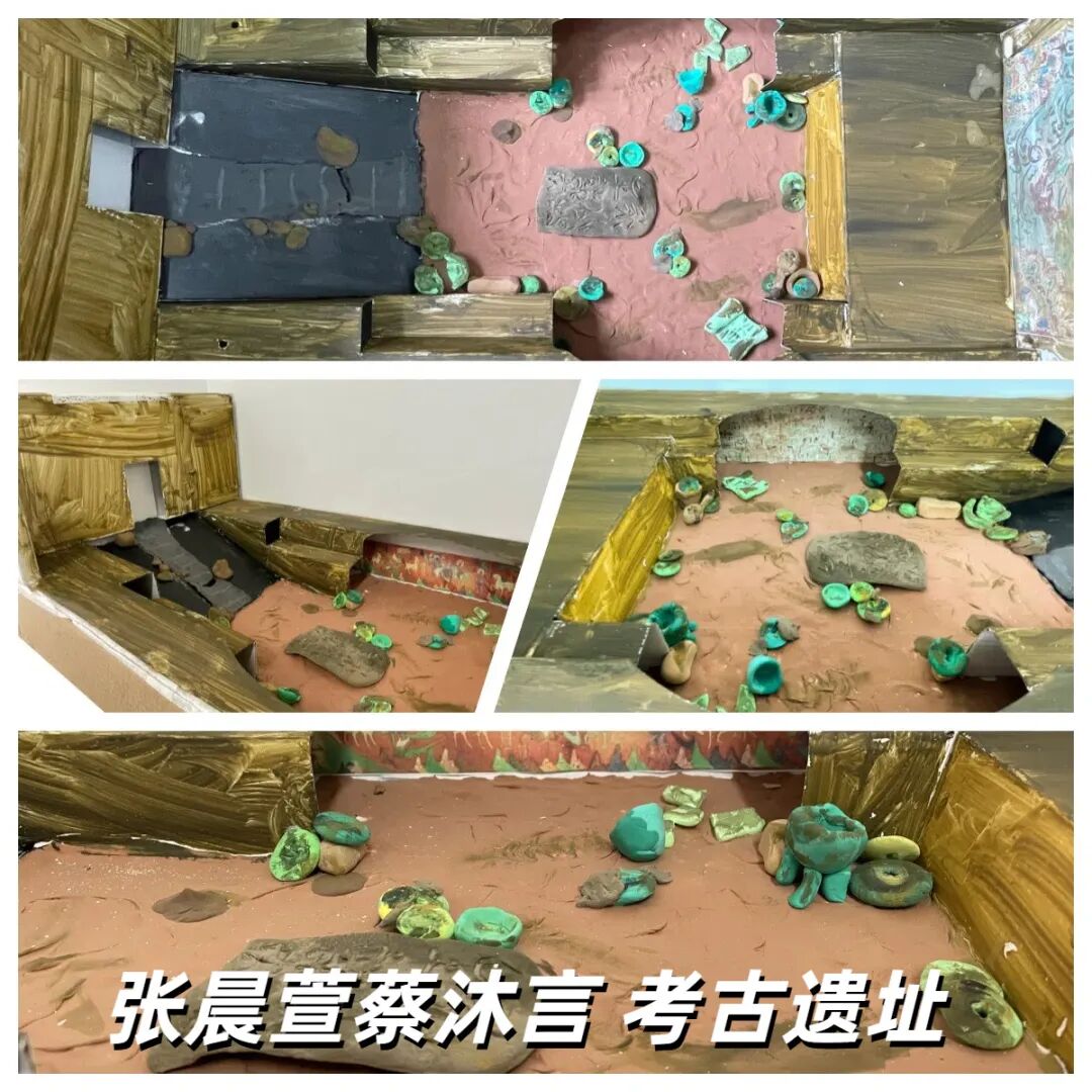 在制作“考古遗址”模型的过程中,我们基于资料,力求还原遗址的原貌。动手实践不仅让我们深入了解了遗址的形态特征,更加深了对考古工作的认知。在制作过程中,如何真实呈现泥土的质感和出土文物的样态成为我们面临的主要挑战。为此,我们尝试使用了多种颜色的原材料,并采用笔涂的方式使之更加逼真。制作过程也让我们体会到团队合作的重要性,每当出现分歧时,我们就共同查阅资料、讨论协商,最终达成一致意见。创意与考证的不断融合,让这个“考古遗址”模型更加栩栩如生。