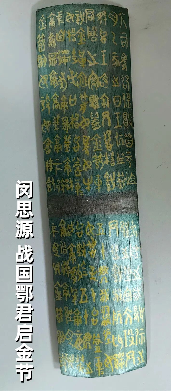 我的作品是鄂君启金节,这是战国商旅通关的“青铜密码”。它沉睡在博物馆的玻璃展柜中,我想让那些镌刻关税律令的文字苏醒。于是我在网上挑选了最亮的金笔和青绿颜料。刷底色时总刷不均匀,急得我只能用笔一遍遍补缺口。临摹篆文是最高难度的环节,那些弯弯绕绕的铭文像小蚯蚓,我写废了无数张草稿纸才找到手感。这次复刻让我发现,历史不仅仅是玻璃柜里的标本。当我的金笔划过竹文,产生奇异的触感,两千年前的关税律令和今天中学生的手汗,竟然在颜料里奇妙地握手。
