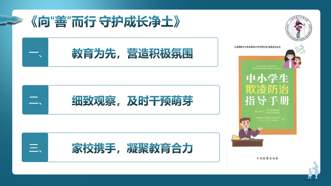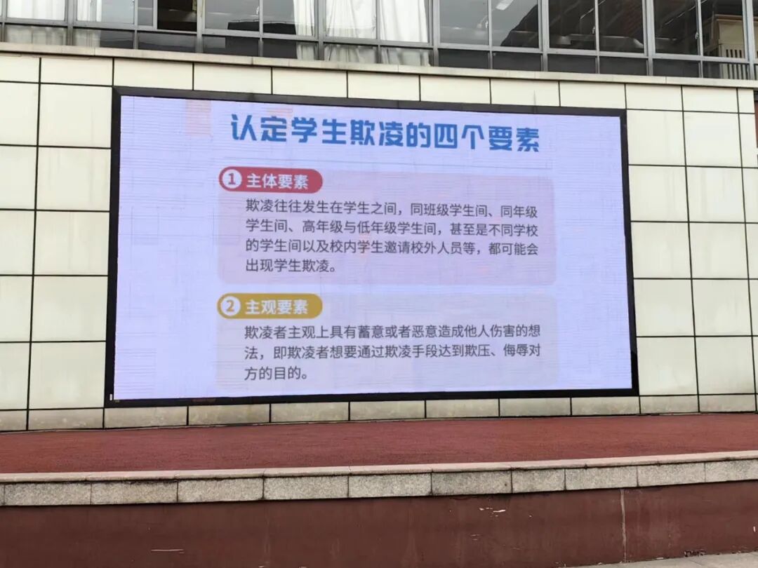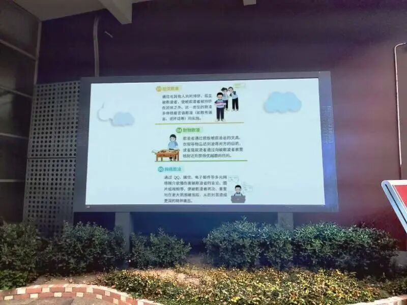 学校通过午间讲座、校园大屏幕播放欺凌防治微课等途径,宣传欺凌行为的危害性,引导同学们敢于表达,培养良好沟通能力;互相礼让,建立和睦的同学关系;彼此包容,营造融洽的校园风气。