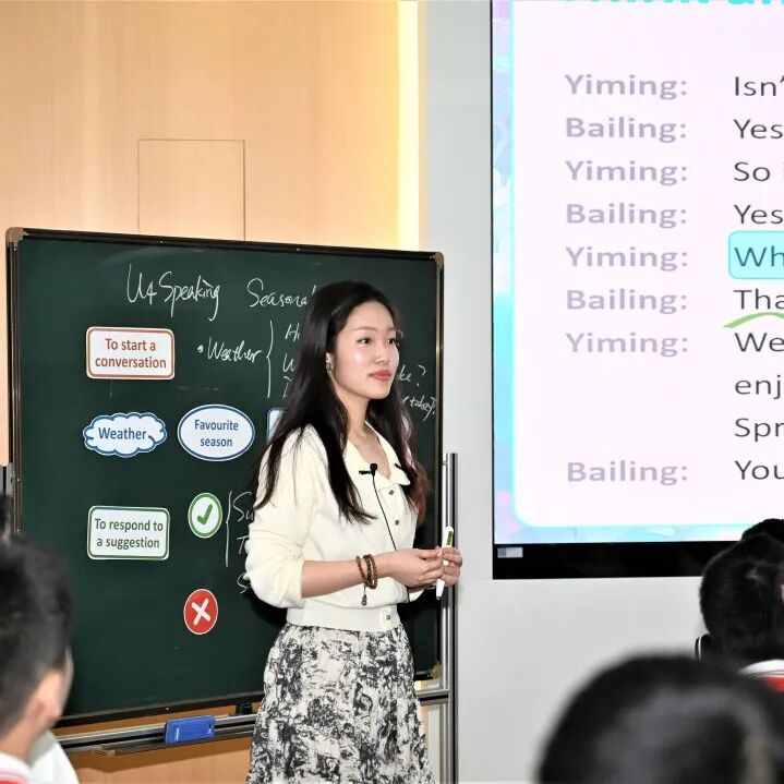 本课教学中,开展了三种教学活动:教师通过多模态季节展板教授季节活动相关词汇;引导学生运用思维导图,梳理人物喜爱的季节,培养信息整合能力;创设情境化口语迁移活动,学生灵活运用“天气寒暄”“建议应答”等交际功能项目,在真实语境中开展自由对话。课堂中,创新引入AI智能体Paul开展人机互动,有效提升了学生语言表达能力。