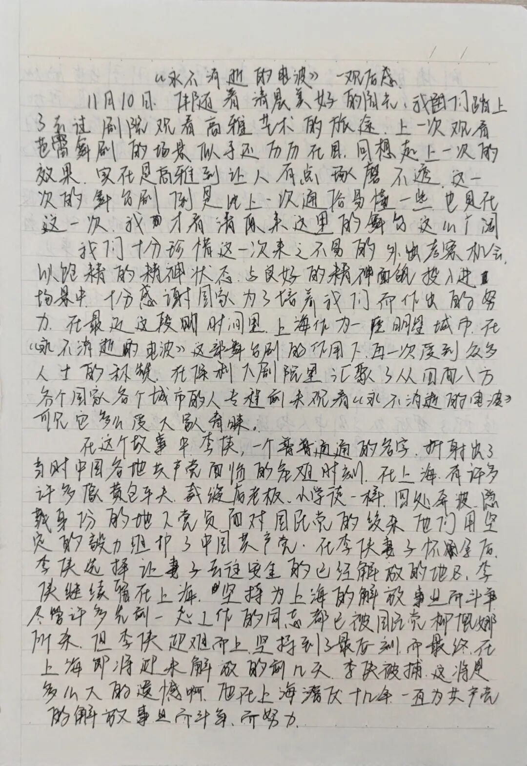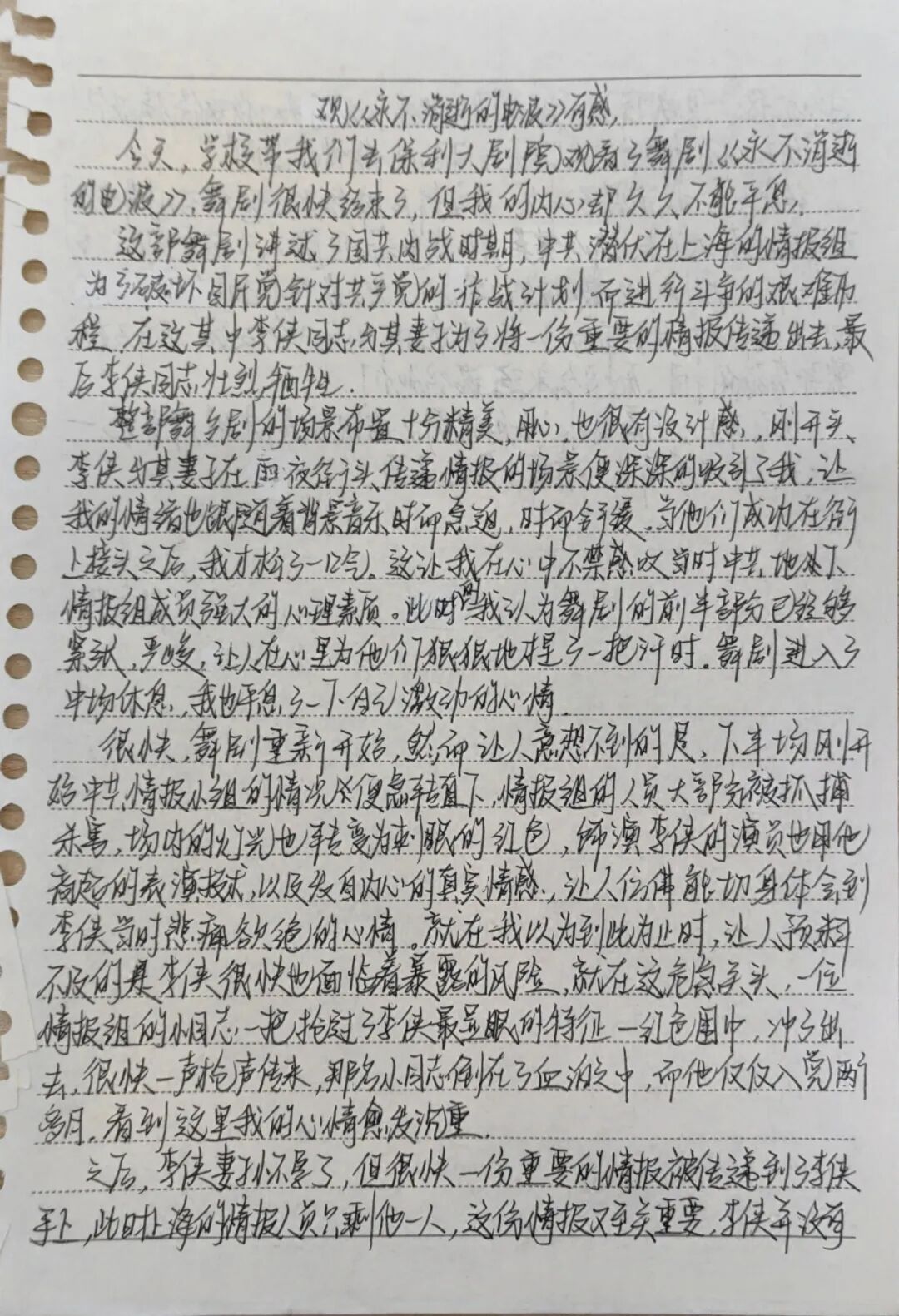 《永不消逝的电波》以真实历史事件为背景,通过精湛的演技、生动的情节和逼真的道具,将观众带回了那个烽火连天的年代。剧中,革命者们面对重重困难与考验,依然坚守信念,用智慧和勇气传递着重要的情报,为革命的胜利贡献了自己的力量。师生们被剧中人物的精神深深打动,不少人的眼眶湿润了,内心涌动着对革命先烈的崇敬与缅怀。