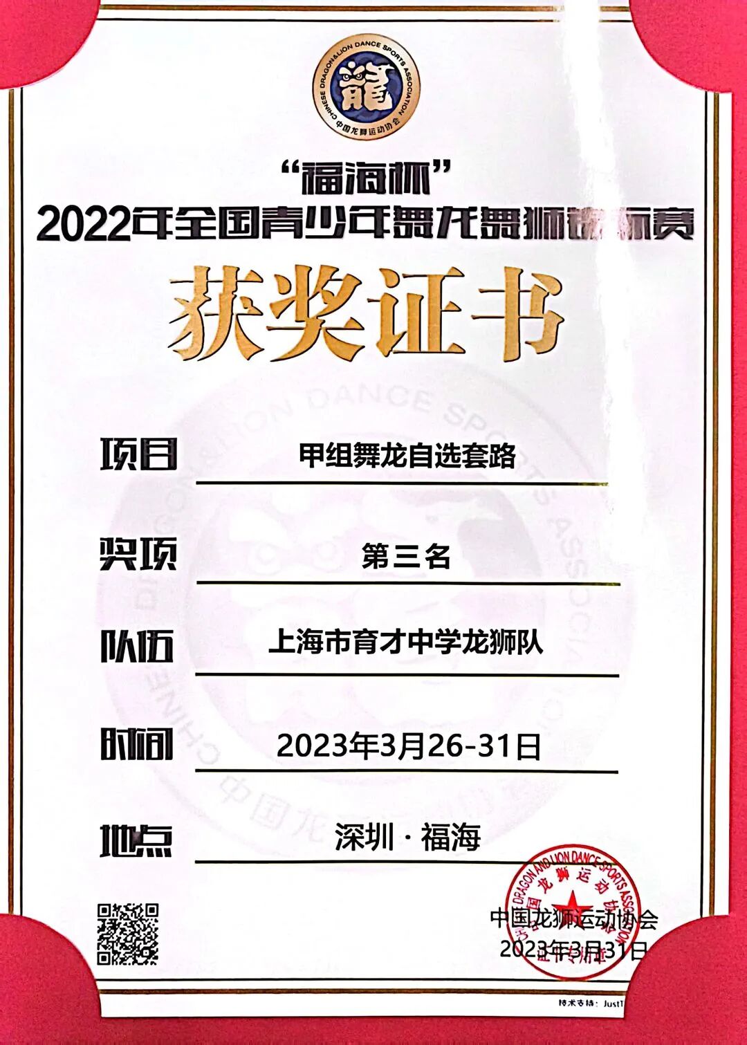 “福海杯”舞龙锦标赛获奖证书