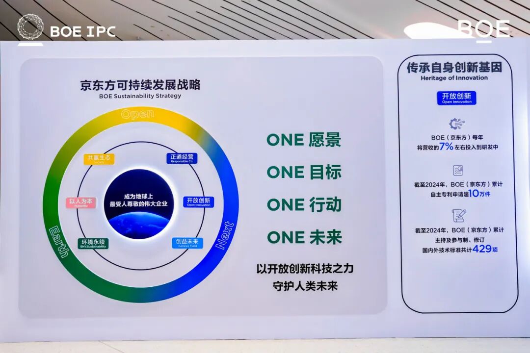 在可持续发展领域,京东方此前已发布行业首个可持续发展品牌“ONE”,以“开放包容(Open)、创新引领(Next)、永续生态(Earth)”为核心理念推动生态共赢。在IPC大会上,京东方联合海信、Meta、E Ink、联想、3M、DNP等产业生态伙伴,以及中国电子商会、中国电子视像行业协会、中国光学光电子行业协会液晶分会、国际信息显示学会、中国—金砖国家人工智能发展与合作中心、中国软件评测中心,共同发布了可持续发展联合倡议: