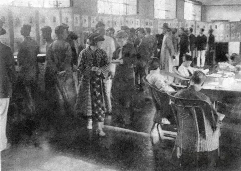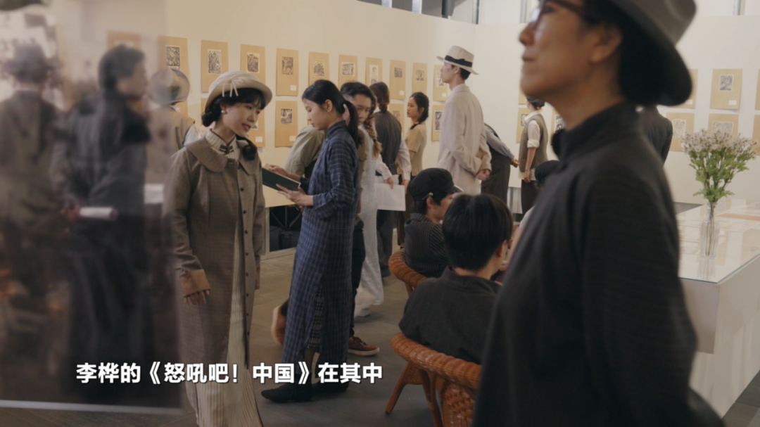 1936年的第二回全国木刻流动展览会,是《烽火木刻》系列叙事中的关键场景。为还原历史,主创团队依照老照片中的人物、服饰,以复刻的方式,联合二十余位演员,借助精准的美术道具,在广东美术学院美术馆实景重现了当年的展览盛况。