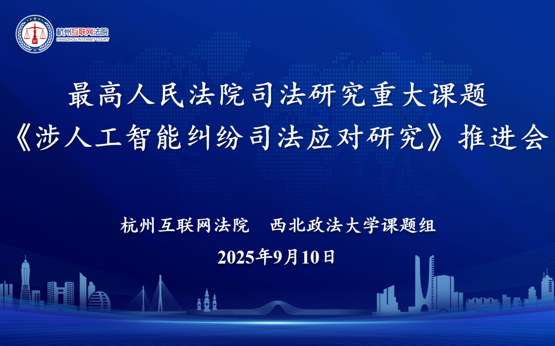 2024年12月27日,杭州互联网法院和西北政法大学课题组中标最高人民法院2024年度司法研究重大课题《涉人工智能纠纷司法应对研究》,这是杭州互联网法院自2020年以来,连续第五次中标最高人民法院司法研究重大课题。2025年2月24日,课题开题论证会召开,明确了研究思路、划定了研究重点、确定了任务分工。其后,课题组撰写了《研究报告》初稿,并邀请相关专家学者对《研究报告》进行了专家论证。2025年7月,在充分吸收专家意见的基础上,课题组上报《研究报告》等成果,顺利通过中期检查。