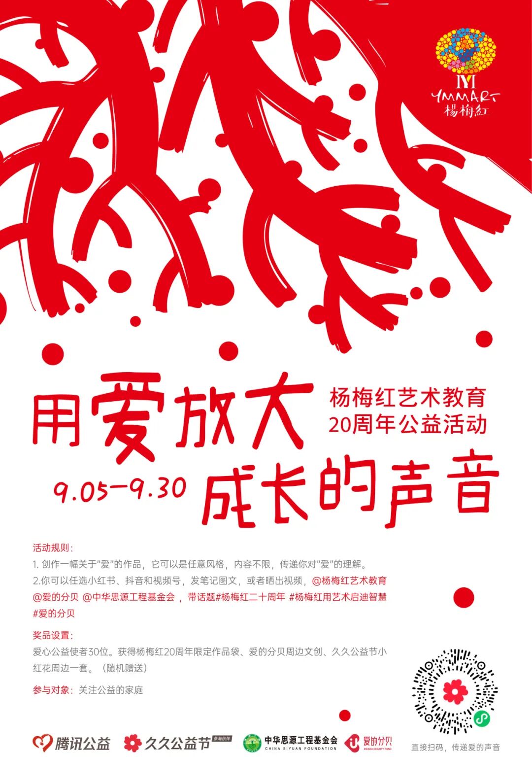 记得@杨梅红艺术教育 @爱的分贝 @中华思源工程基金会 ,带话题#杨梅红二十周年 #杨梅红用艺术启迪智慧 #爱的分贝。