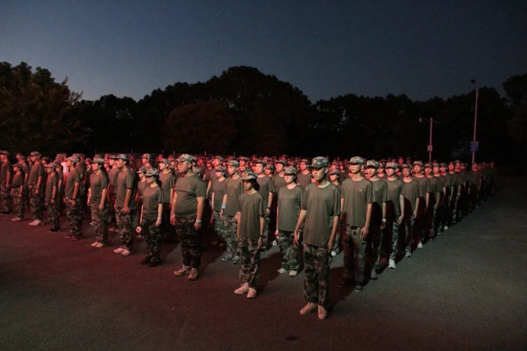 夜幕低垂,星光点点,白日炙烤大地的热浪还未退去,但操场上灯火通明。"一、二、三、四!"口号声划破夜空,脚步声铿锵有力。