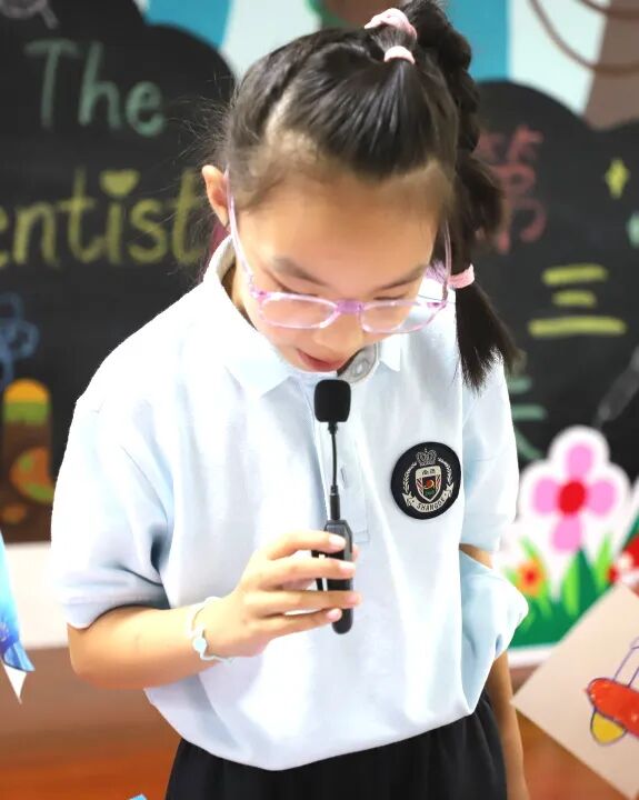 英语天地中,一年级小思考家们化身“小小科学家”,戴上放大镜,辨认藏在眼镜卡片上的神秘单词,用显微镜破解英语句型密码,还戴上炫酷的科学家假发,高唱趣味儿歌!