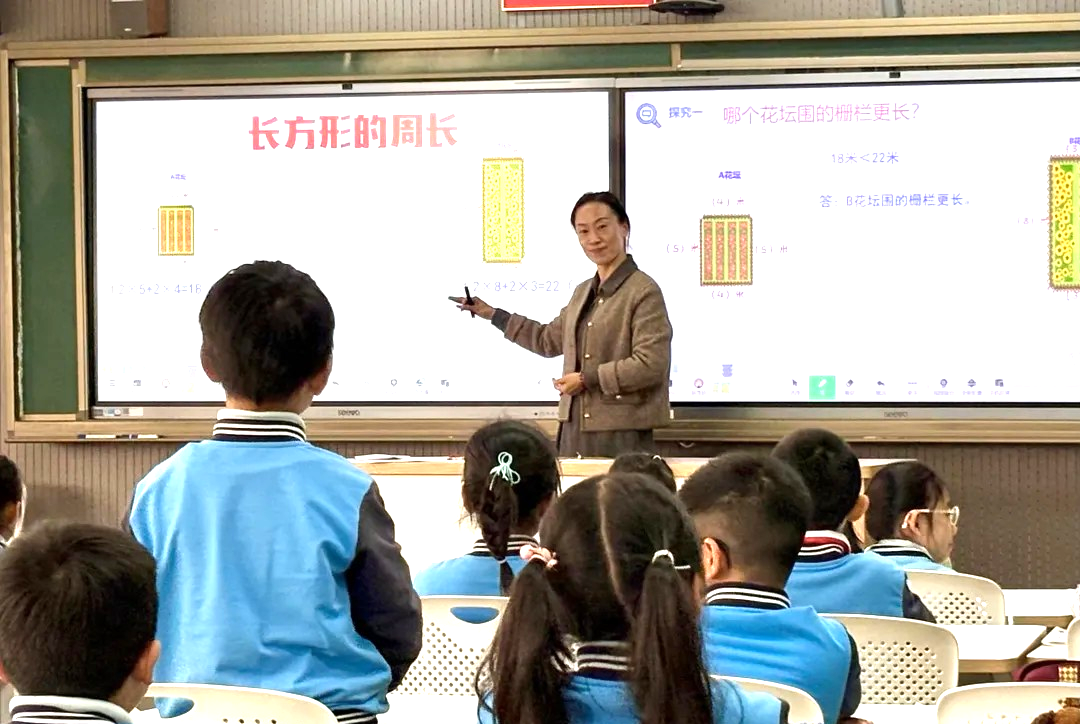在三年级数学《长方形与正方形的周长①》一课中,在新授环节充分发挥学生的主观能动性,教师充分放手,以小组合作学习的方式实现新知的探究。同时,教师对提问设计进行逐句打磨,聚合碎片化问题,增加开放性问题,给予学生更多的表达空间,为学生搭建更广阔的表达平台。
