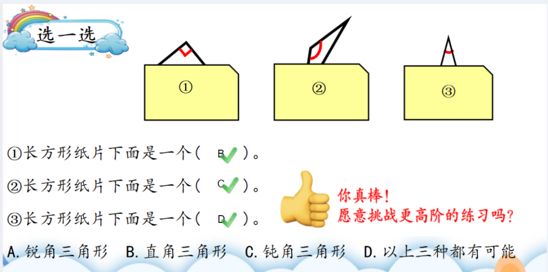 在二年级数学《三角形的分类》一课的教学中,教师将学件设置为根据学生实时答题正误自动推送解题提示或进入下一个难度层次的练习,弹性任务推送系统实现从统一指令到分层适配的精准跃迁。同时,教师可根据学生答题情况调整练习的讲解时长与互动频次,灵活切换“精讲重难点”或“小组自主探究”模式,提升课堂参与度。