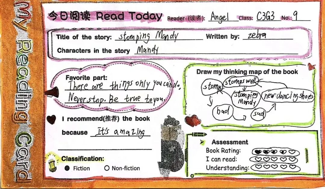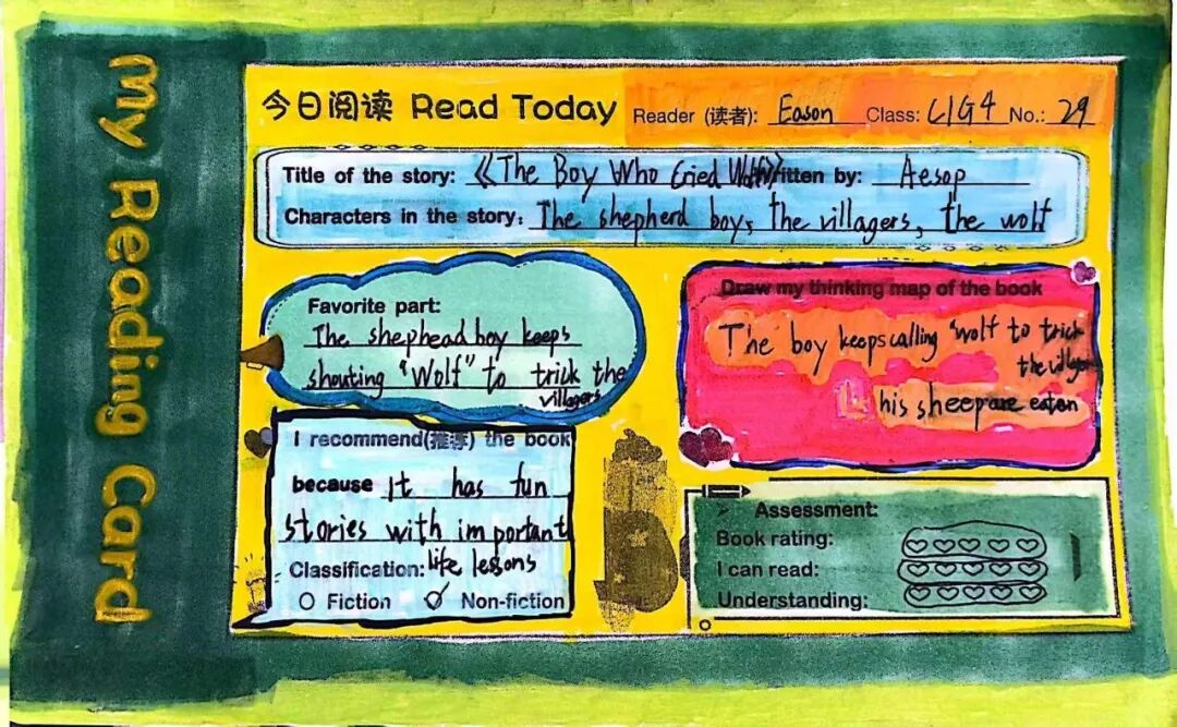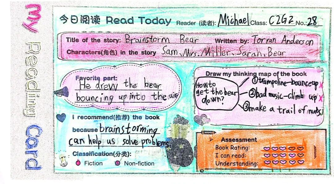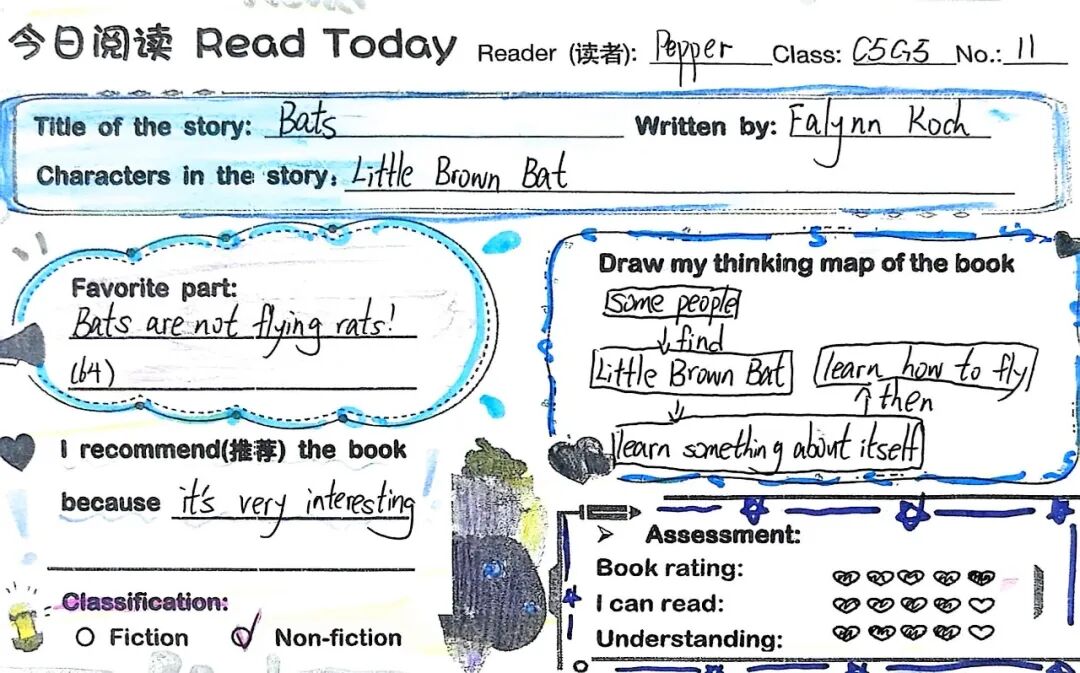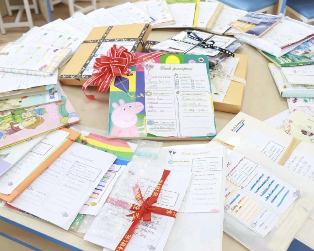 学生制作全英推荐卡并投递至"阅读盲盒站"。他们在卡片上撰写推荐理由、绘制思维导图并添加插图。盲盒交换活动打破年级壁垒,让低年级学生在模仿中学习,高年级学生在示范中精进。