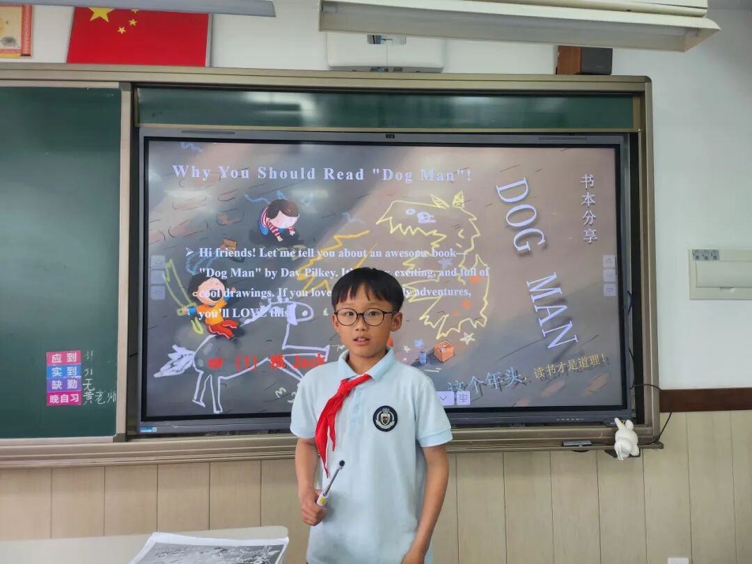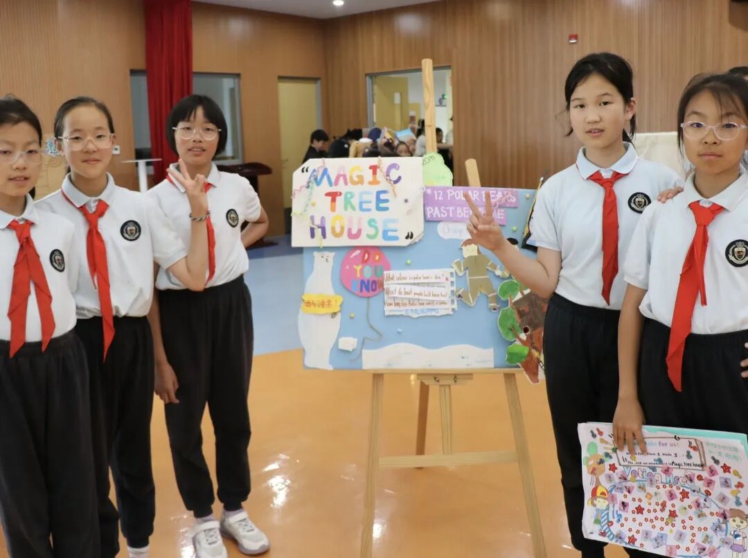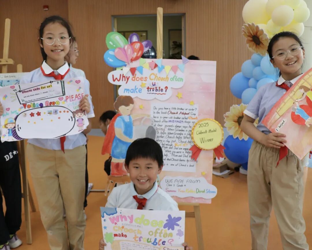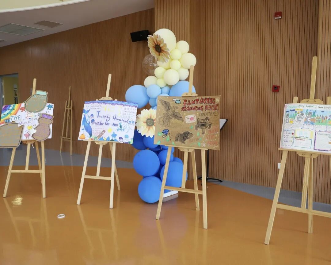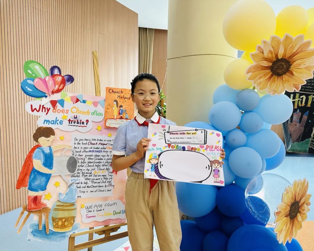 四五年级学生充分发挥创意,自由组队,自主制作创意海报,他们运用图文结合、手绘插画等设计手法,精心打造海报,直观呈现书籍特色,并向全校学生推荐。活动现场,高年级的学生化身"小导师",自信满满地站在海报前,用流利的英文进行演说。最终评选环节,低年级学生用"I like this book because..."句式参与投票,在实践中初探英语评价表达,而高年级的演说展示则成为鲜活的语言示范案例。