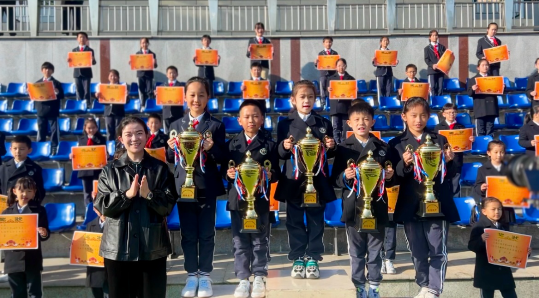 颁奖典礼上,全校师生欢聚操场,共同见证这一激动人心的荣耀时刻。最后,由邢校长为获得团体总分第一的班级颁发奖杯。