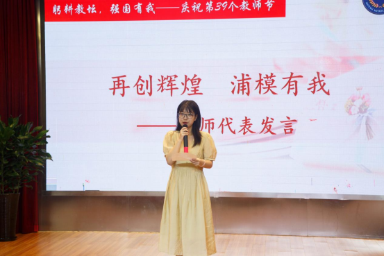 以德立身,润物无声。浦模教师始终秉持着“功成不必在我,功成必定有我”的高尚情操,兢兢业业,默默耕耘。值此教师节来临之际,大会隆重表彰了在2022年业务考核中斩获优秀的各位教职工。他们师德高尚、爱生如子,他们甘于奉献,勇于创新,他们治学有方,管理有道。杨洁老师和顾玮老师作为教师代表发言。杨洁老师的发言幽默风趣,发人深省,他谈到在新教改背景下,我们需要不断学习,优化知识结构,改善思维品质,提高洞察能力,来应对新变化、新局面。![]()