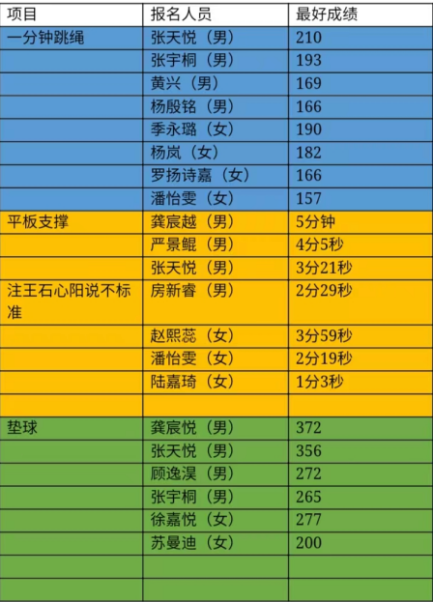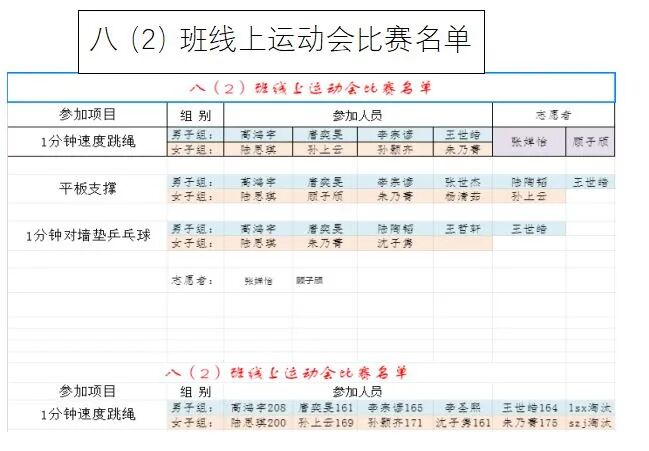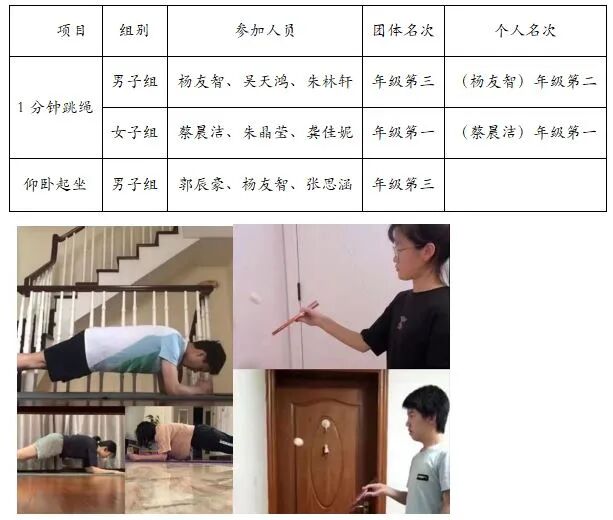 线上运动会:(1分钟跳绳,仰卧起坐、平板支撑、1分钟对墙垫乒乓球)