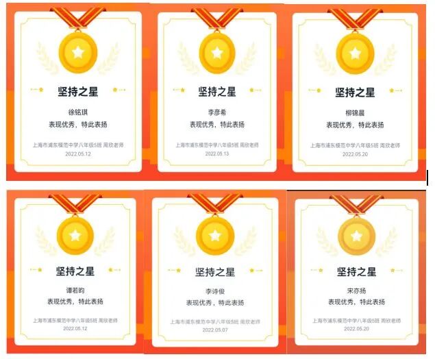从本周起,每周的三、四、五 学校分别对六、七和八年级的“模范学生评比(居家版)”第一阶段(4月-5月)的若干模范评比项目进行公示。