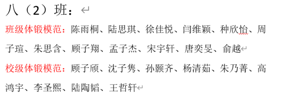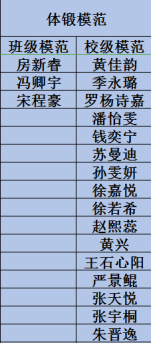 1.班级体锻模范:董思蕙、龚佳妮、刘雅琴、陆露晨、钱奕馨、赵明明、范沈源、林子东、张睿祖、张思涵、朱翰生