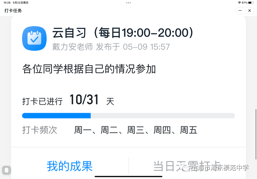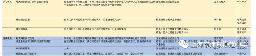 班级:分为三项。一、周一至周四19:00之前在文件夹上传交作业所有记录,周末周六12:00之前上传,一周2次以上。二、每天写反思。在打卡任务中上传,一周2次以上。三、一周做一个作息表。三项中完成一项,即可获得一周的自律达人。
