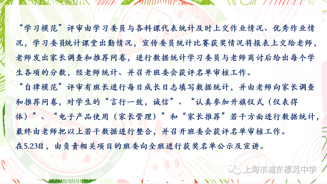 班级:分为两项。一、默写每周平均分75分以上或数学优秀作业1次以上,二、阅读打卡,一周3次以上。两项中达标一项,获得一周的班级模范。