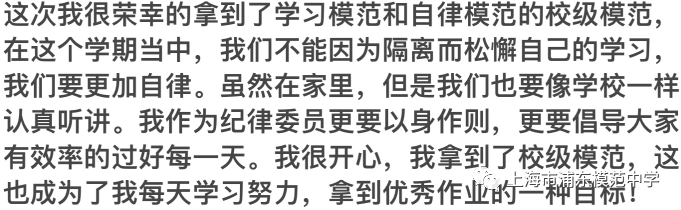 三月的上海遇到一场突如其来的疫情,使我们开始了居家学习。但是并不妨碍每学期的模学生评比,班委及老师们认真制定评比细则,使其公平公正。疫情开始我就制定作息表,每天督促自己按计划安排好学习生活,仔细记录成长日志,早睡早起。积极参与孝心及体育打卡活动做到一次不落。在学习方面我认真按时完成作业,以优秀作业为榜样,努力提升自己。此次班级评比我也积极参与统计工作,有幸获得校级自律和学习模范,我以此为动力,今后将更加严格要求自己,不辜负老师同学的望。疫情虽让我们不能去学校学习,但停课不停学,让我们一起努力争当模范学生!