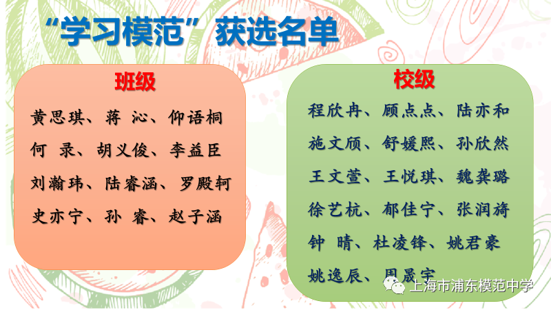 校级:分为两项。一、默写每周平均分80分以上或数学优秀作业3次以上,二、阅读打卡,一周5次以上。两项均达标,获得一周的校级模范。