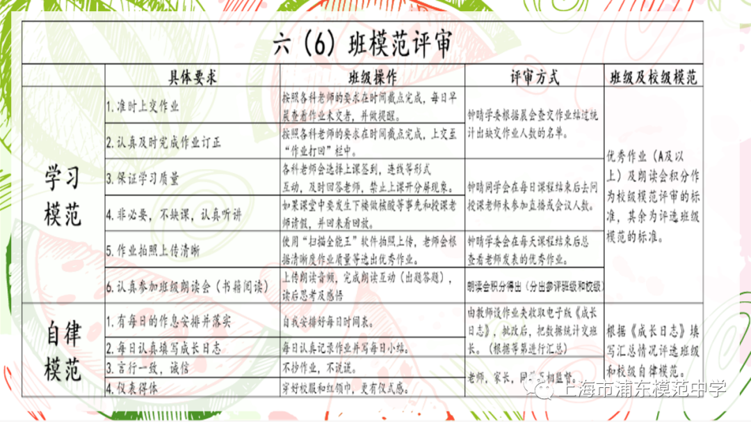 以下为六年级各班对“学习模范”和“自律模范”评比项目开展情况。