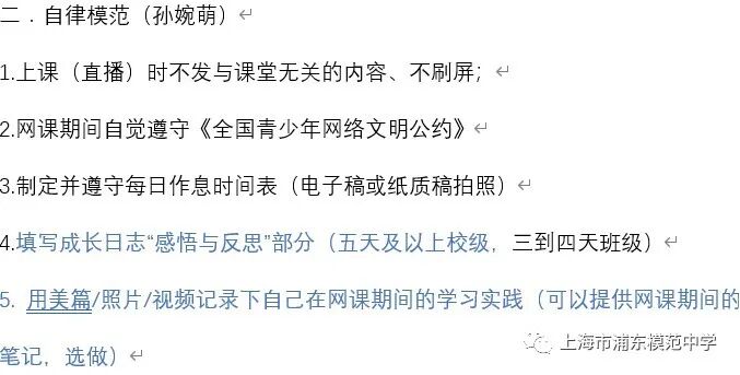 我班的模范细则是由班主任牵头,班委成员多次内部讨论形成初稿,再组织全体同学学习,达成共识后才形成的。细则结合居家期间实际情况,具有指导性、操作性,鼓励全体学生积极参与。