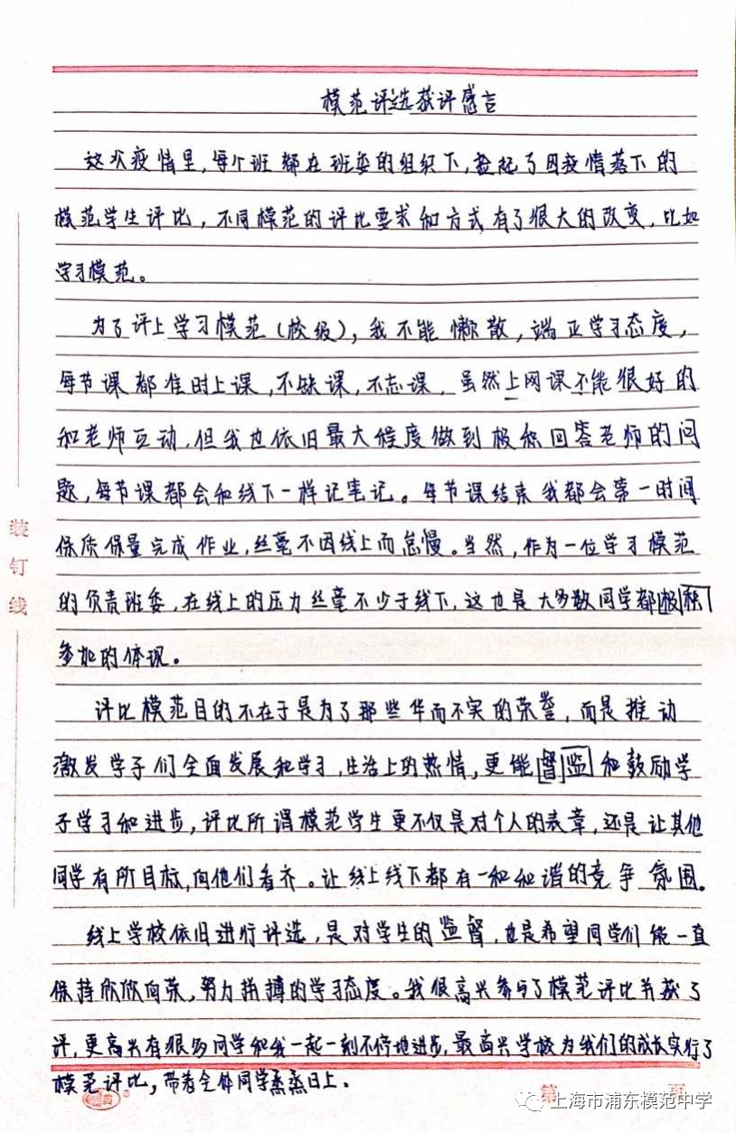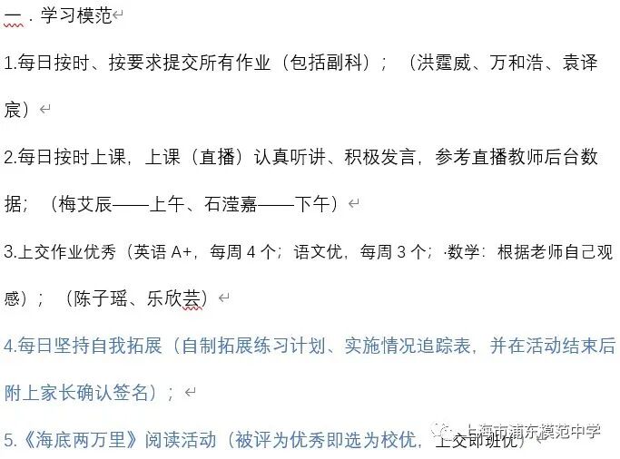 段同学:模范评比不分线上线下,有的只是你个人的自律。班委们、老师们的监督使我们在疫情居家生活中也更加的自律。我班的方案谨慎考虑了每个同学的上课表现、休闲娱乐表现等等,设计十分的人性。