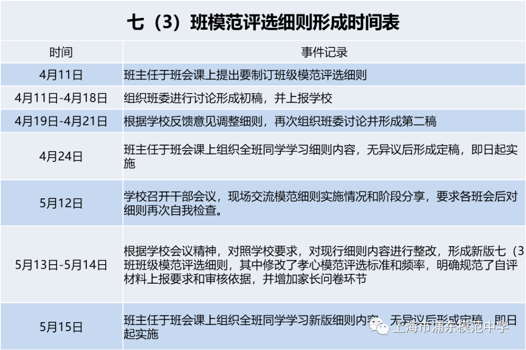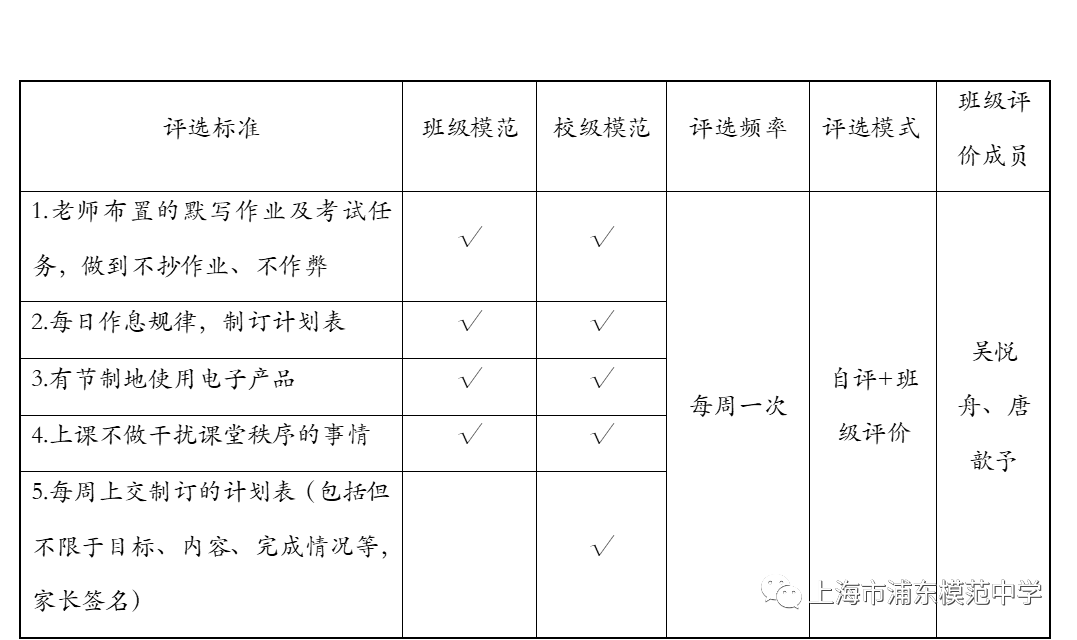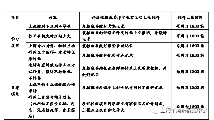 (1)评选流程:按周评选,每周六18:00前每位同学对本班各项模范完成自评(钉钉班级群自评表在线编辑),每周六18:00前参评同学的家长完成认可推荐问卷(钉钉班级群会发布问卷),每周日18:00前班级评价成员对各自负责的模范版块进行复核。最终评选结果由班长汇总后于每周一上午在班级钉钉群公示。