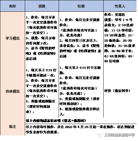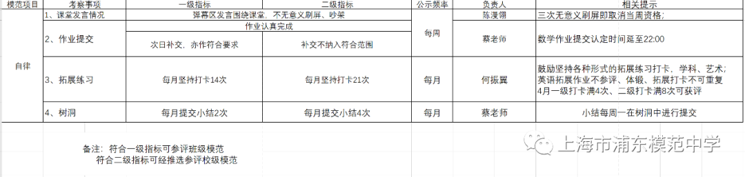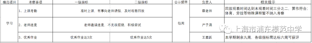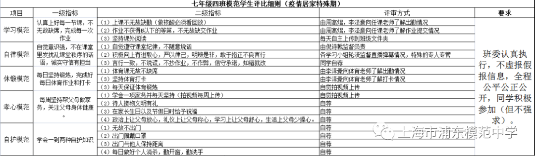 从本周起,每周的三、四、五 学校分别对六、七和八年级的“模范学生评比(居家版)”第一阶段(4月-5月)的若干模范评比项目进行公示。