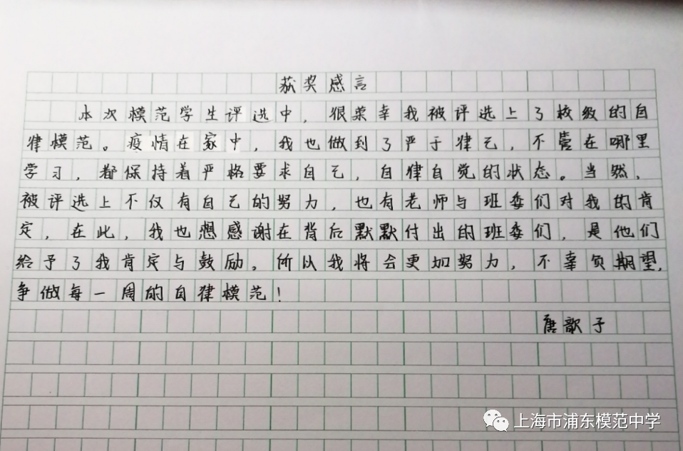 柯同学:即使现在我们因为疫情被“关”在了家里,但模范学生的评比仍要继续,这是传统,更是让大家都能够有一个目标并且朝着目标去努力,这无疑是我们自律学习的最大动力之一。就算是在家,也能规律好作息,早睡早起,认真听讲并做好笔记,是一个能够从他律转为自律的大好机会。