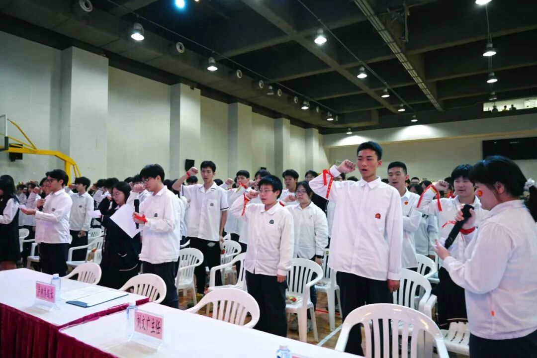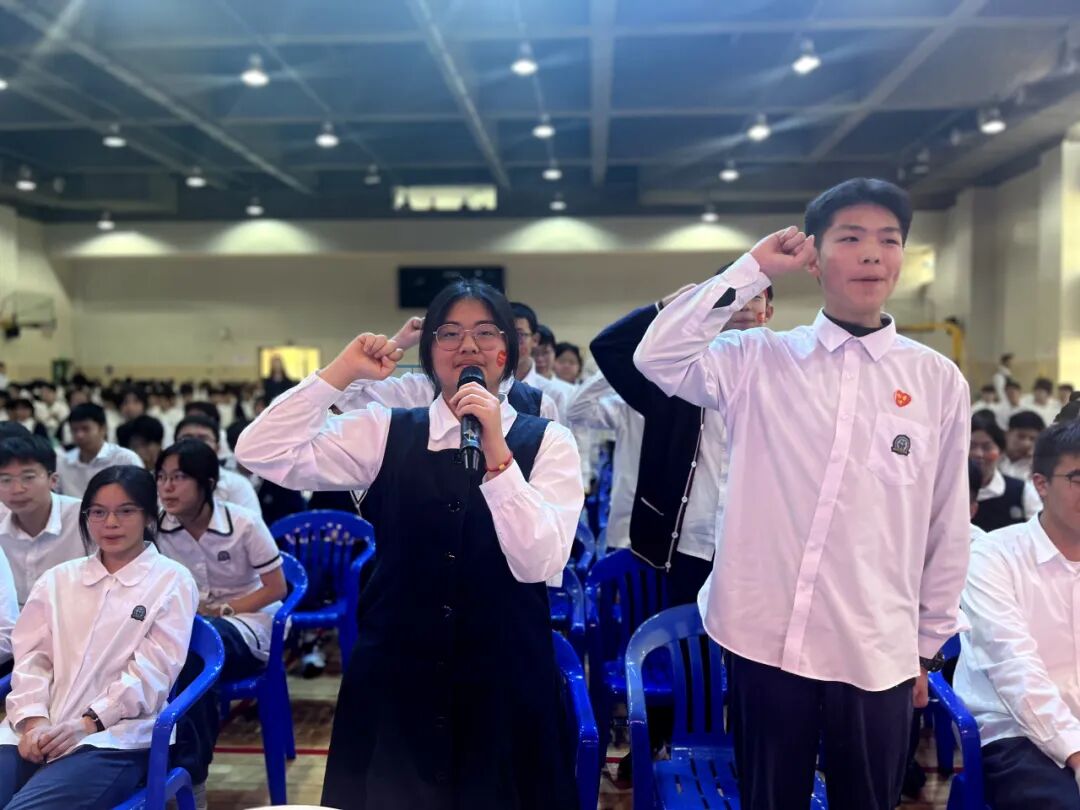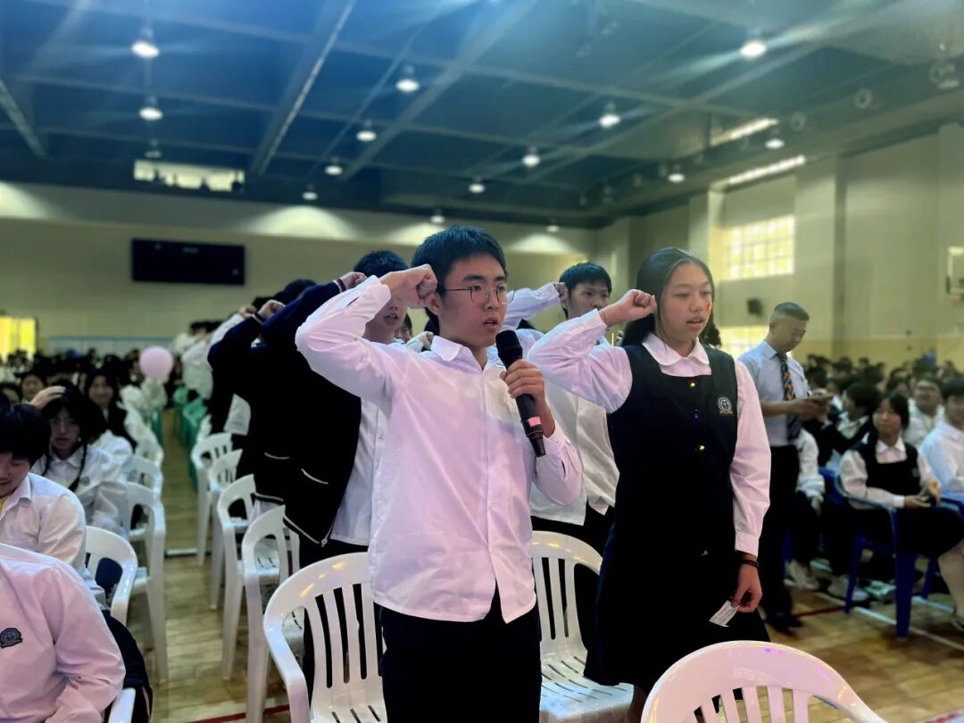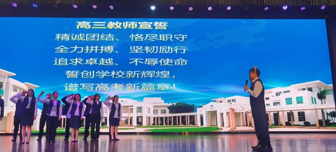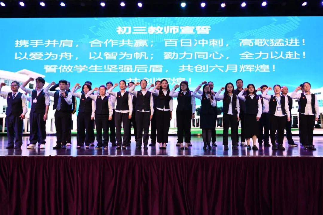 誓师大会现场,既有殷切的祝福,也有全体初三高三教师庄严的承诺。奋斗的路上,陪伴是最长情的告白。初三高三两位级长带领全体教师,举起右手,向学生做出庄严承诺。老师们用铿锵有力的誓言表达了对学子们的坚定支持和无私奉献的决心;声声誓言,气壮山河,回荡在每一位祈福学子心头,温暖如春。
