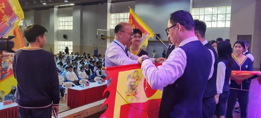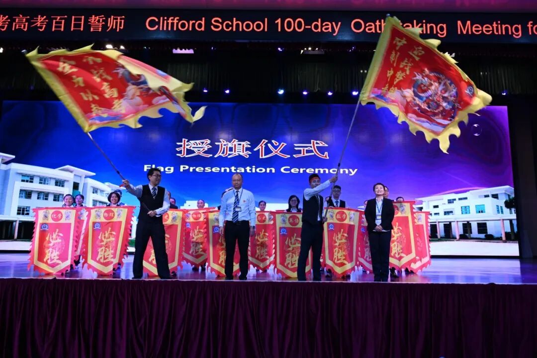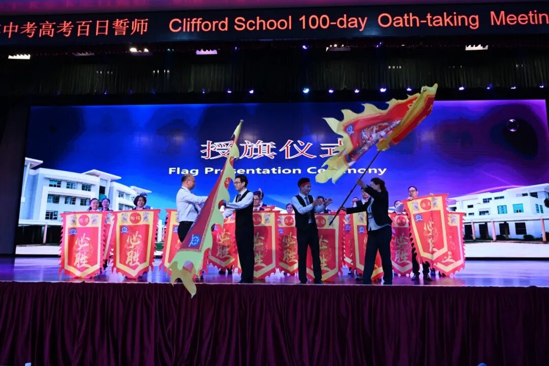 在100天揭牌和授旗仪式这庄重而激动人心的时刻,祈福英语实验学校郑小兵校长、韩轶敏副校长、初三高三家委、初三高三级长在大家的共同见证下,徐徐拉下100天牌匾,紧接着郑小兵校长授旗给各科备长。授予旗帜,是交付责任;接递旗帜,是传承辉煌。此刻国际楼一楼体育馆里战旗飘扬,舞出奋战百日的信心,更舞出冲刺高考的斗志。