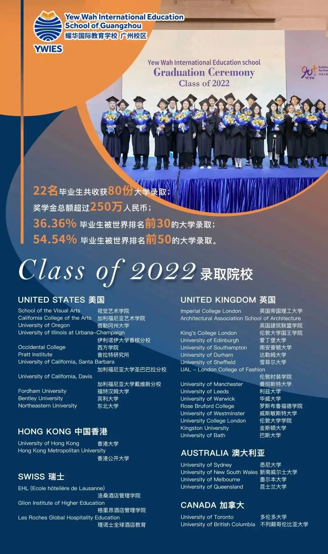 自2014年开学以来,我校的毕业生以优异的成绩和突出的表现获得众多世界名校的青睐。毕业生100%获得海外或中国香港等地的大学录取,其中60%毕业生获得世界Top50高校录取。录取院校包括:英国方向的剑桥大学、牛津大学、帝国理工学校、伦敦大学学院、爱丁堡大学曼切斯特大学等英国院校,澳大利亚方向的悉尼大学、墨尔本大学、昆士兰大学等,美国方向的纽约大学、加州大学、伊利诺伊大学厄巴纳-香槟分校、普渡大学等,中国香港方向的香港大学、香港中文大学、香港科技大学,也有伦敦艺术大学、加州艺术学院、芝加哥艺术学院等艺术院校。
