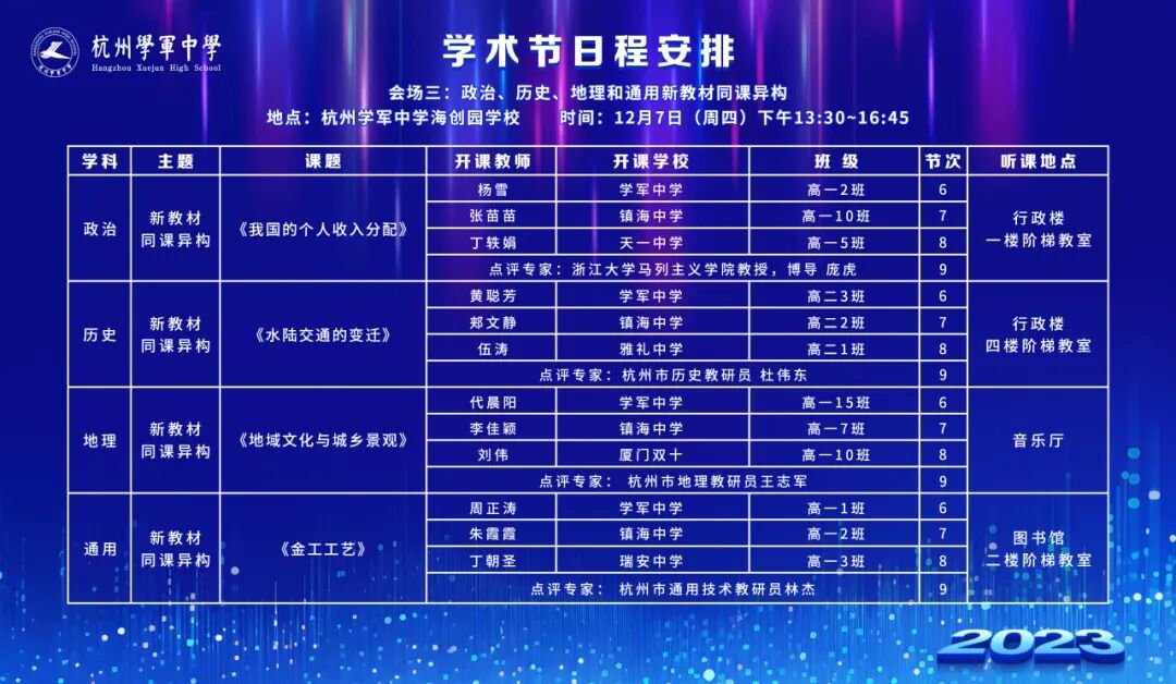 7日下午,学术节第三模块活动“政治、历史、地理和通用技术新教材同课异构活动”在学军中学海创园学校举行。学军中学各个校区的政治、历史、地理、通用技术教师,以及宁波镇海中学、江苏天一中学、长沙雅礼中学、厦门双十中学、瑞安中学等三十余所兄弟学校的领导、老师集体出席,参加本次活动并做了深入研讨。