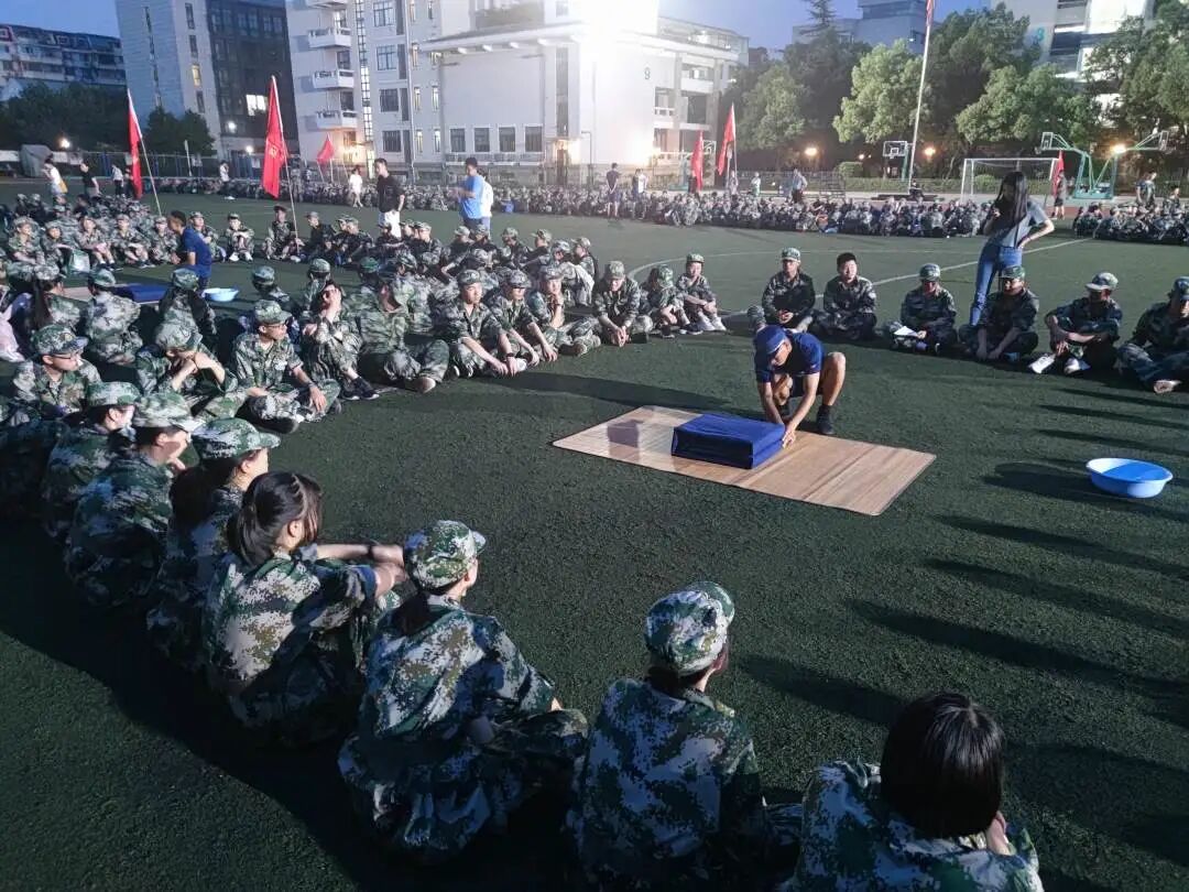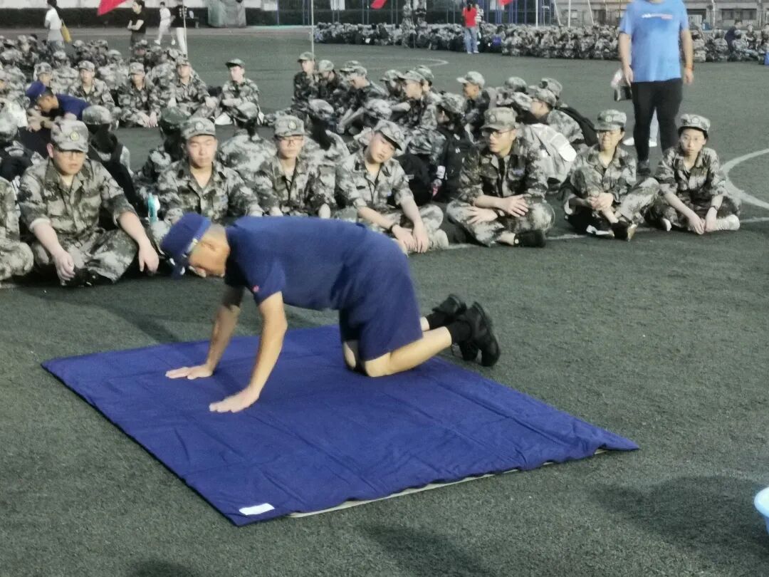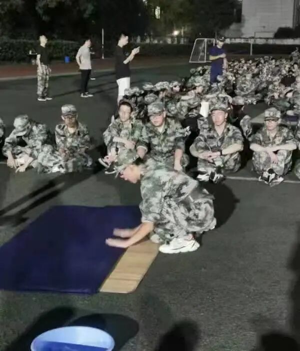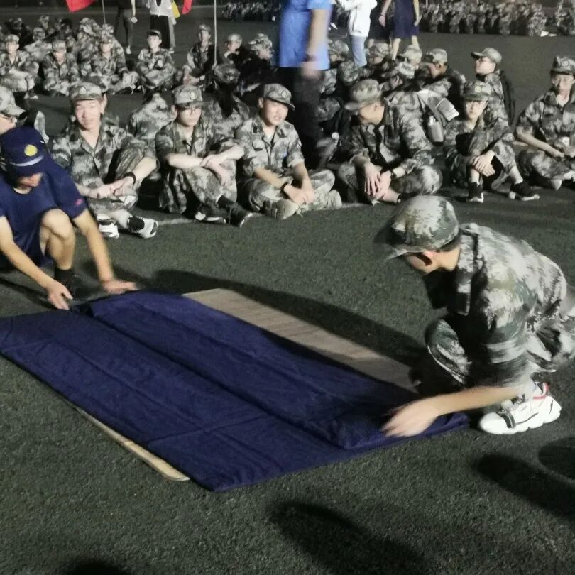天色渐暗,各连队围坐在操场草坪上,跟着教官学习“豆腐块”的制作技巧。