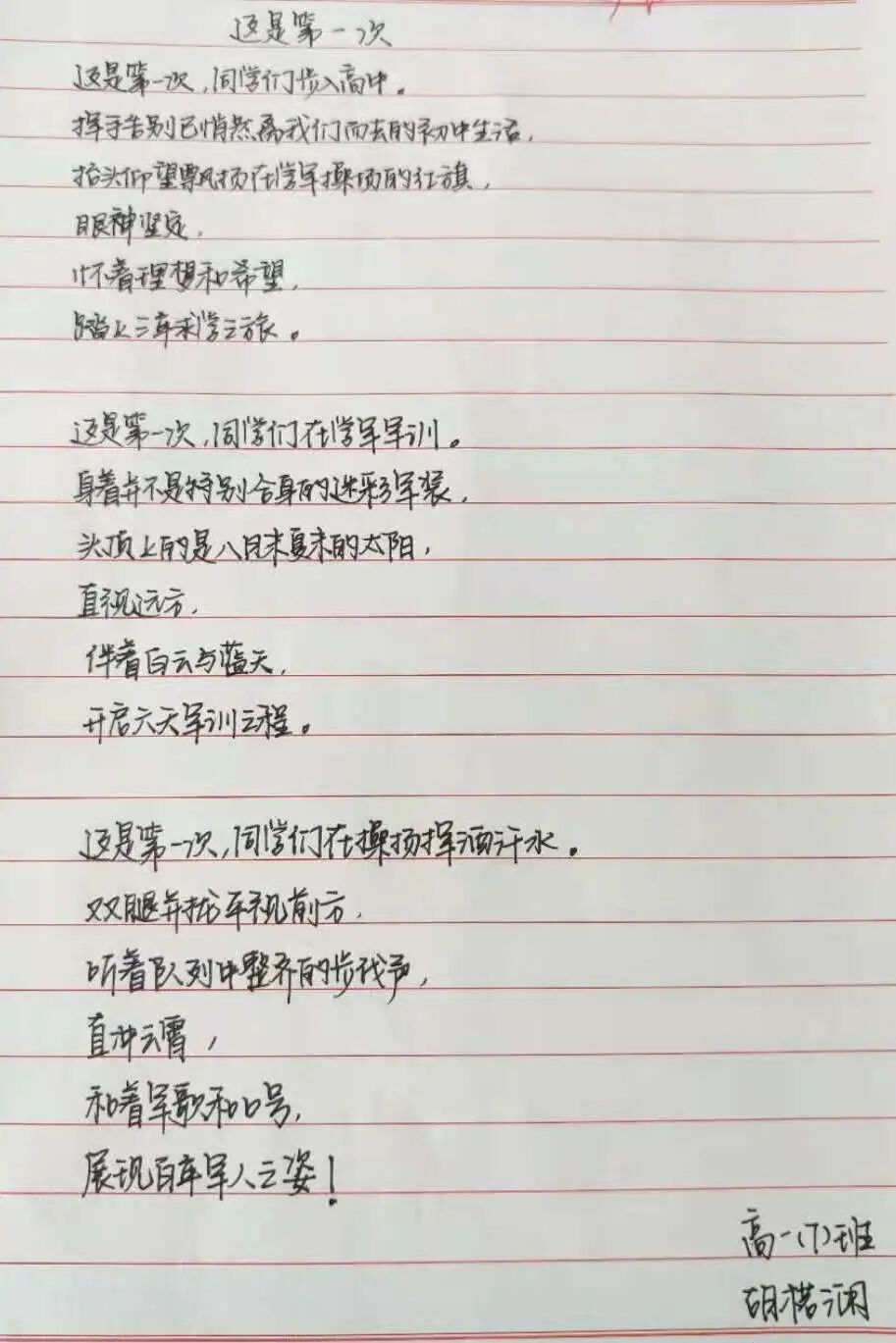 看到了老师发在班级群里的视频,骄阳下,你和同学们站军姿,唱军歌,任汗水肆意流淌,你们个个岿然不动,眼神坚定,英姿飒爽!我的眼眶竟有些湿润,是感动!更是骄傲!