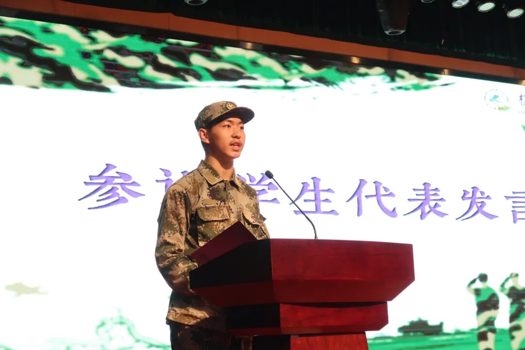 “千磨万击还坚韧,任尔东南西北风”,军训是一场青春的磨砺。参训学生代表高一(16)班的许长明同学说:“军训是对我们‘劳其筋骨’的考验,也是对我们‘苦其心志’的磨炼。没经历过军训的高中生涯是不完整的,在这过程中能锻炼我们的体质,增强我们的意志。骄阳似火、挥汗如雨,只有经过艰苦的军训,我们才能说自己是堂堂正正的学军人。”随后,他倡议全体参训同学在接下来的军训中要坚决服从命令,与同伴团结合作,不做逃兵不逃避,展现出学军人如同军人般的意志与气概。许同学的发言铿锵有力,掷地有声,正是同学们一腔热血的青春宣言。