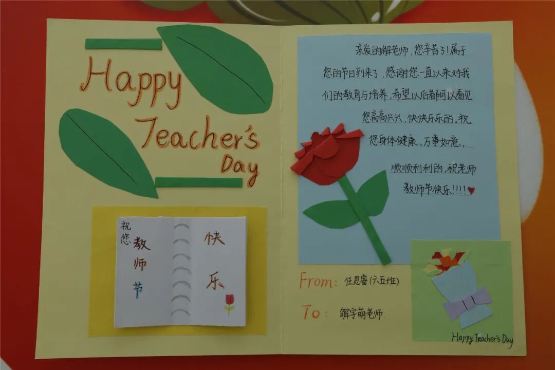 中午,校学生会成员将同学们主动送来的手做贺卡集中整理,一一送到6至9年级组和行政办公室,同学们暖心的祝福,让老师们绽放出纯真可爱的笑容。