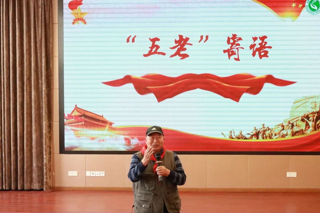 校关工小组常务副组长、原区少先队总辅导员金品良同志寄语新队员们“听党话、跟党走,争做党的好孩子。”