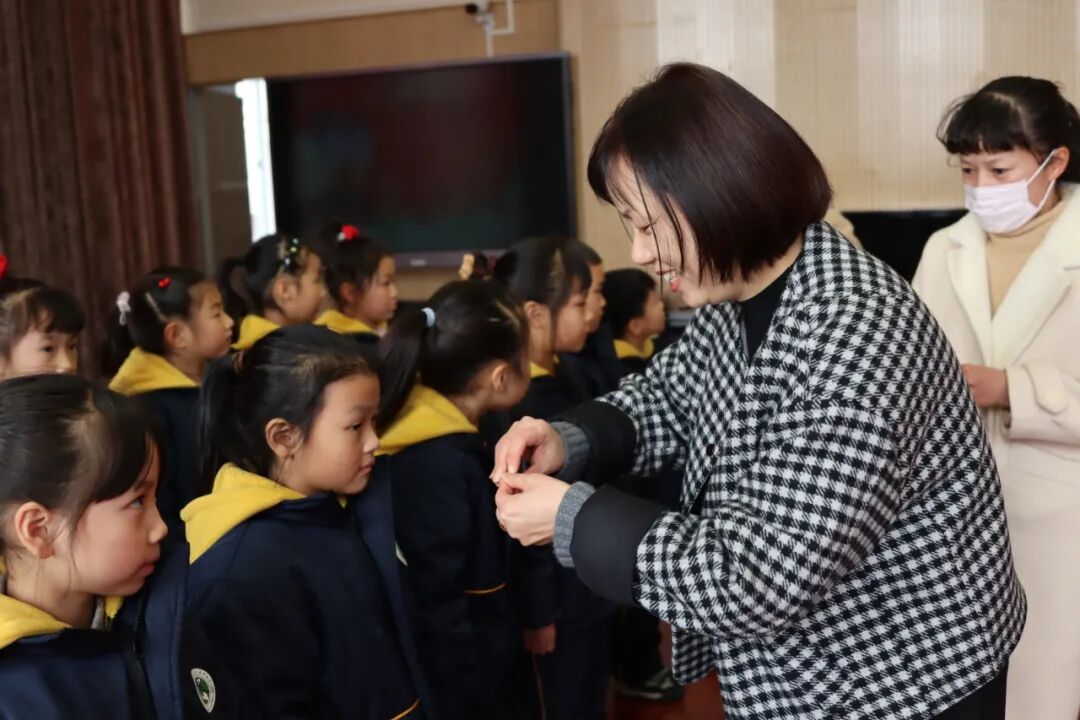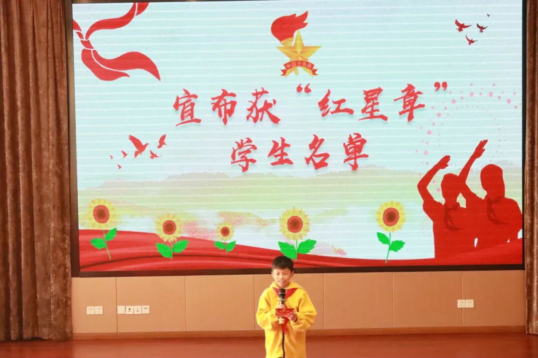 大队委员范佩恩庄严宣布获得“红星章”的学生名单。每一声名字的响起,都是对小月芽努力和成长的肯定。校领导、各班辅导员老师和家长代表们为获章学生佩戴上了“红星章”。