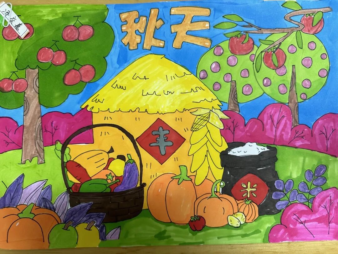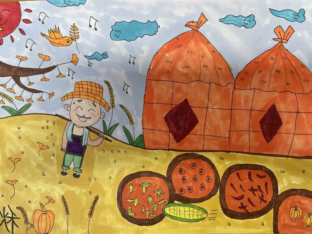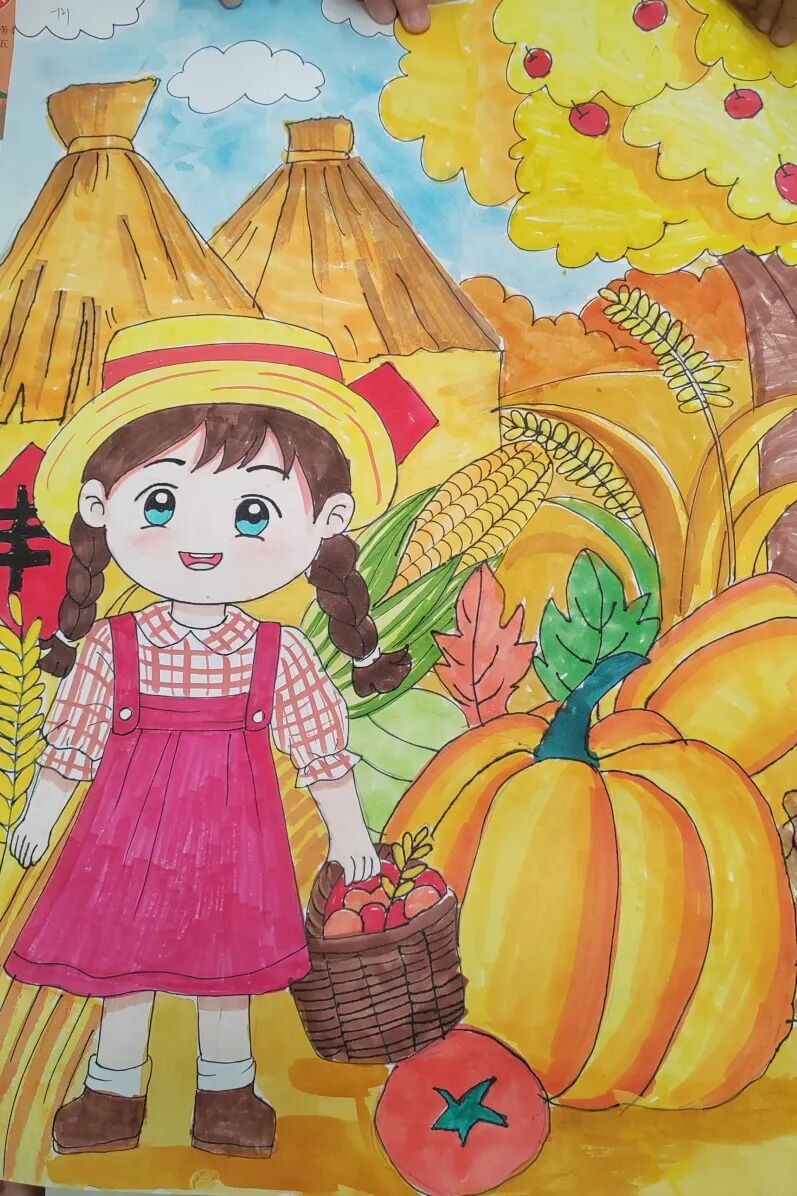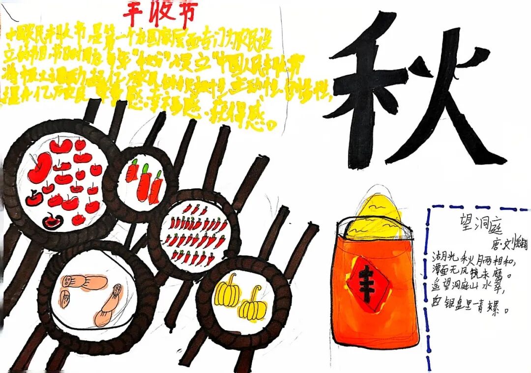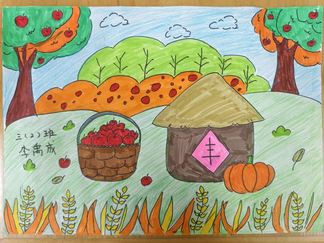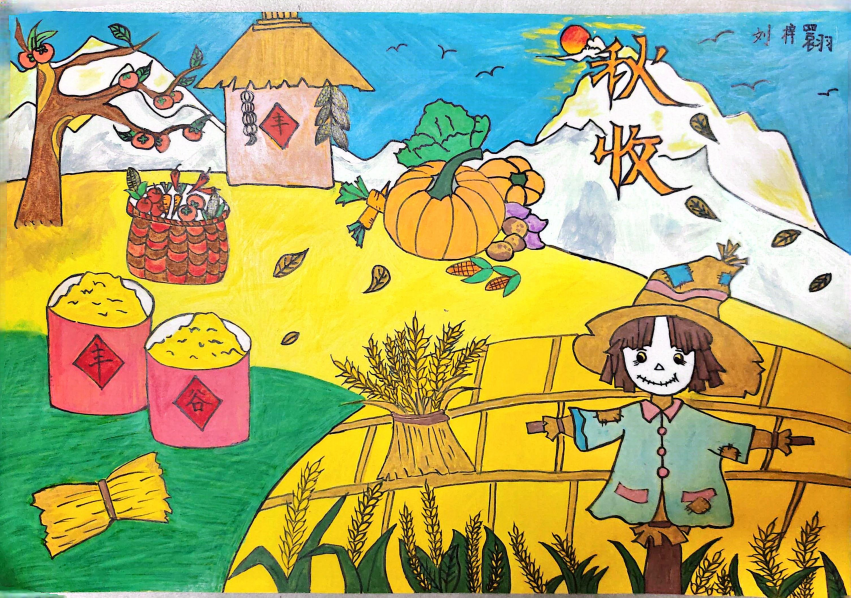 一、二、三年级小月芽用彩笔描绘丰收景象,四、五年级小月芽用彩笔设计丰收小报,共同捕捉秋天硕果累累的景象,歌颂百果成熟、大地飘香的丰收成果。