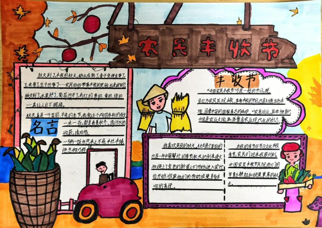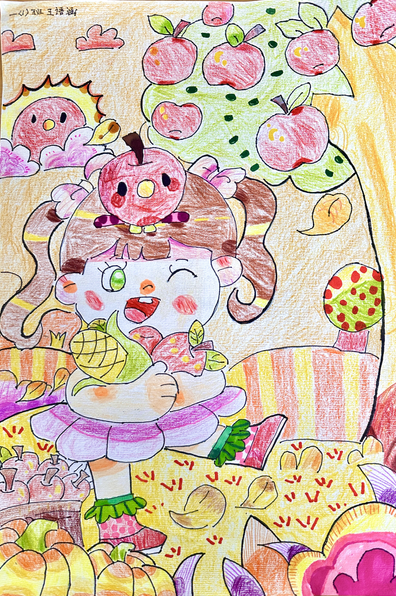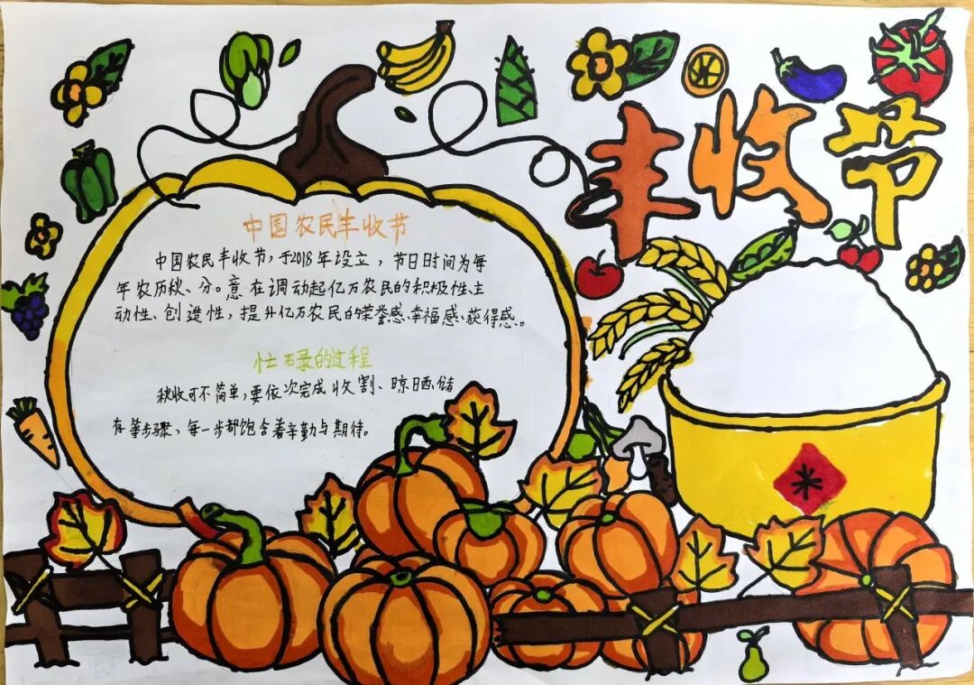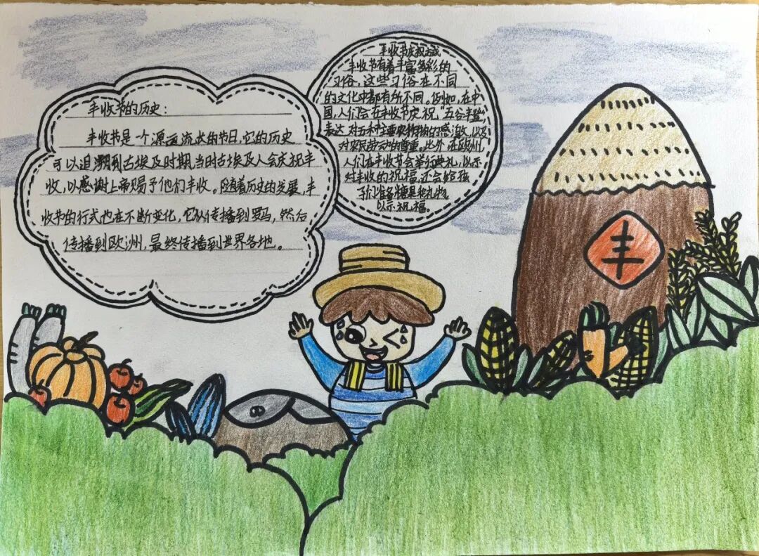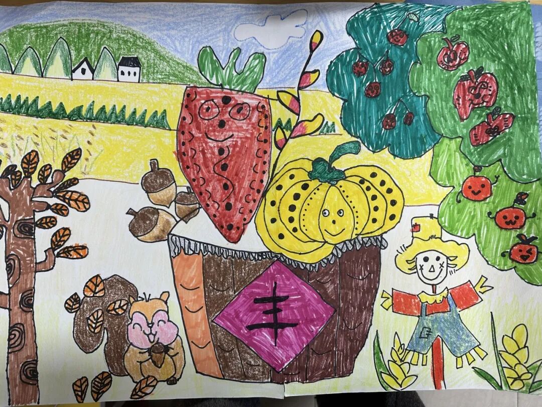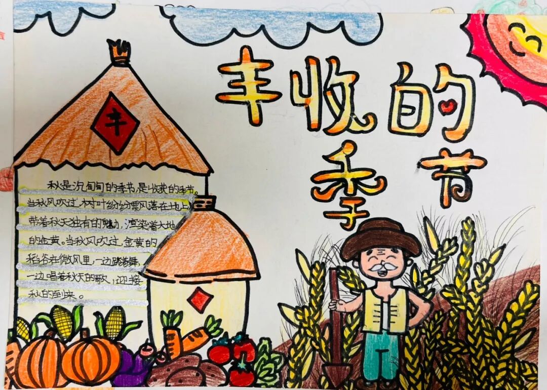 一、二、三年级小月芽用彩笔描绘丰收景象,四、五年级小月芽用彩笔设计丰收小报,共同捕捉秋天硕果累累的景象,歌颂百果成熟、大地飘香的丰收成果。