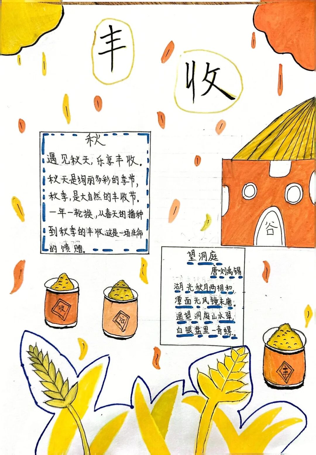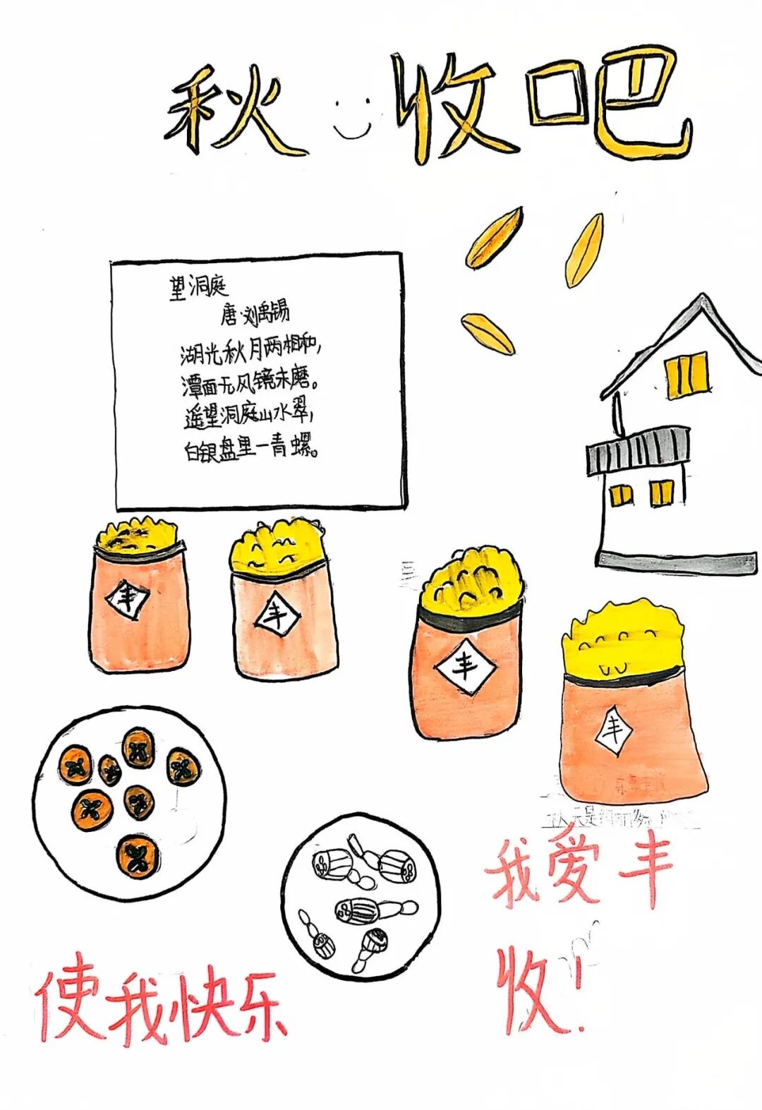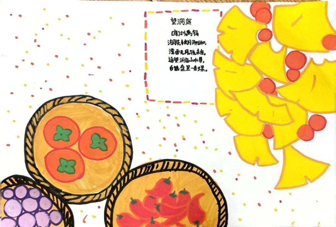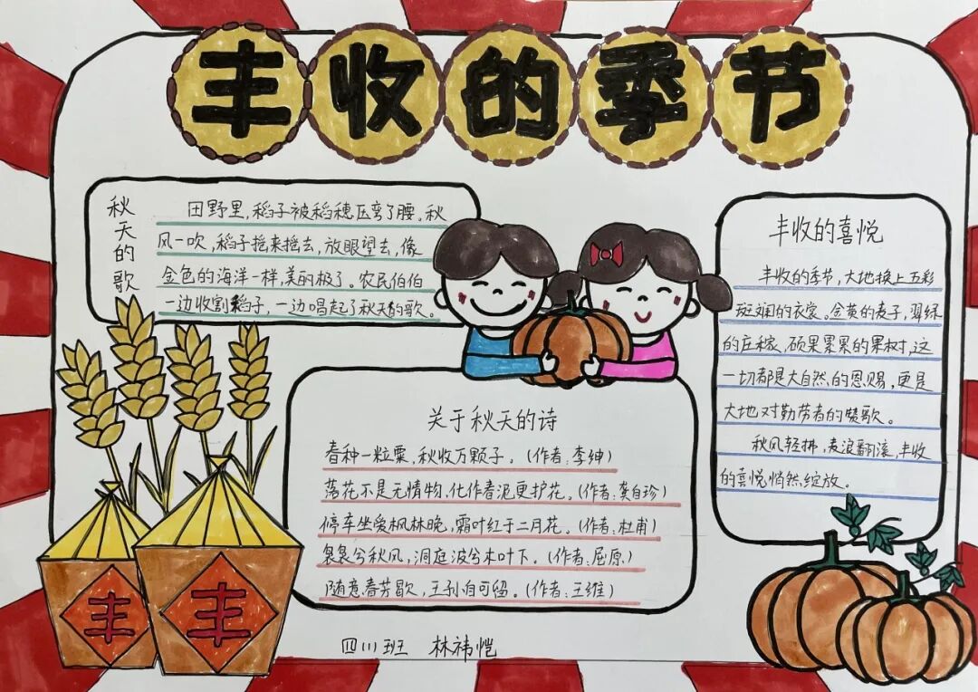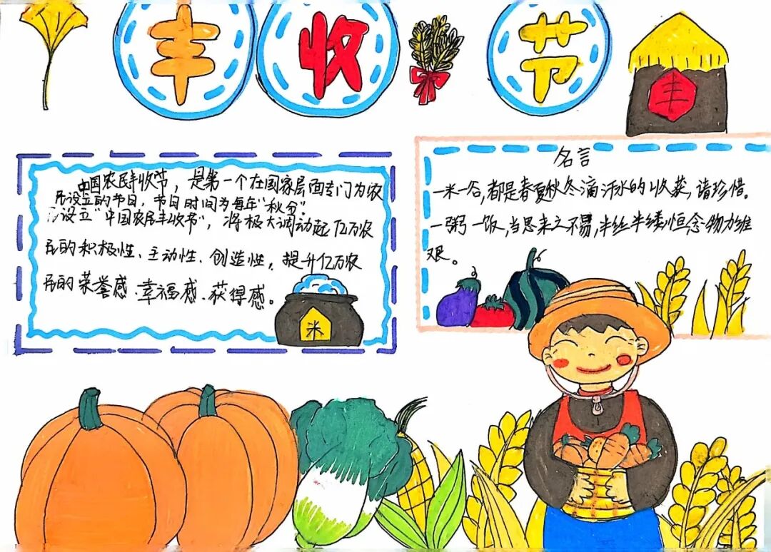 一、二、三年级小月芽用彩笔描绘丰收景象,四、五年级小月芽用彩笔设计丰收小报,共同捕捉秋天硕果累累的景象,歌颂百果成熟、大地飘香的丰收成果。