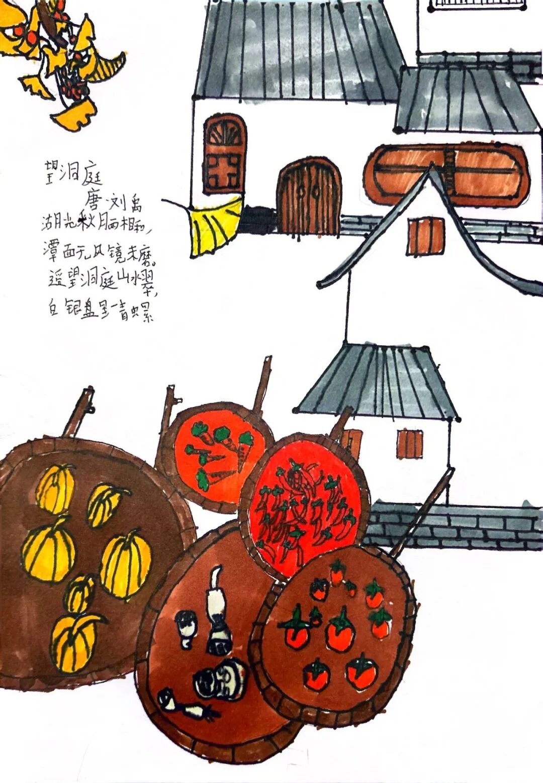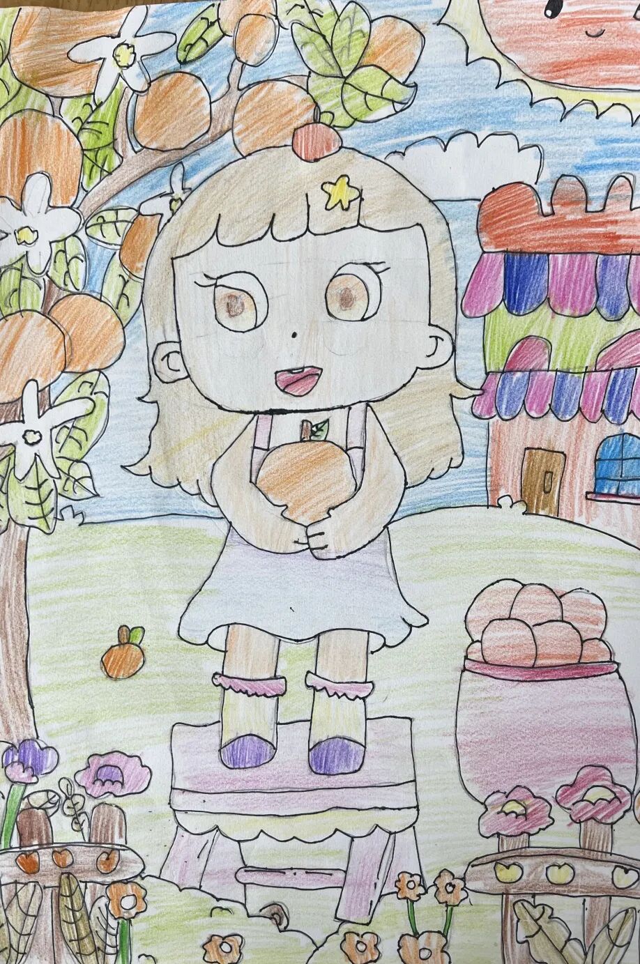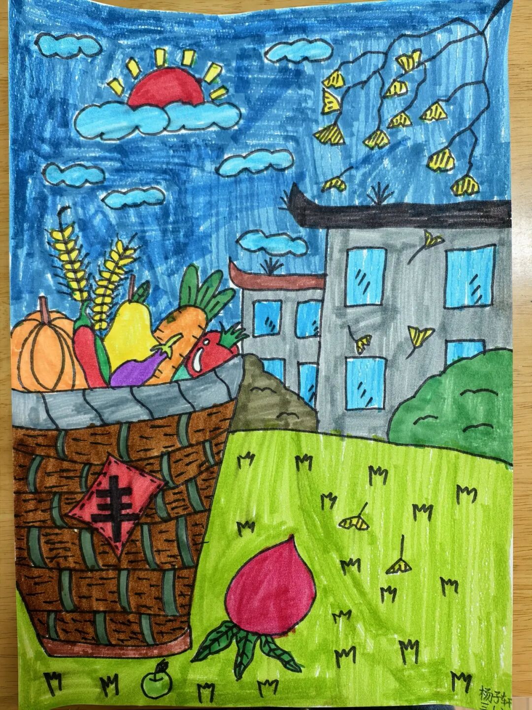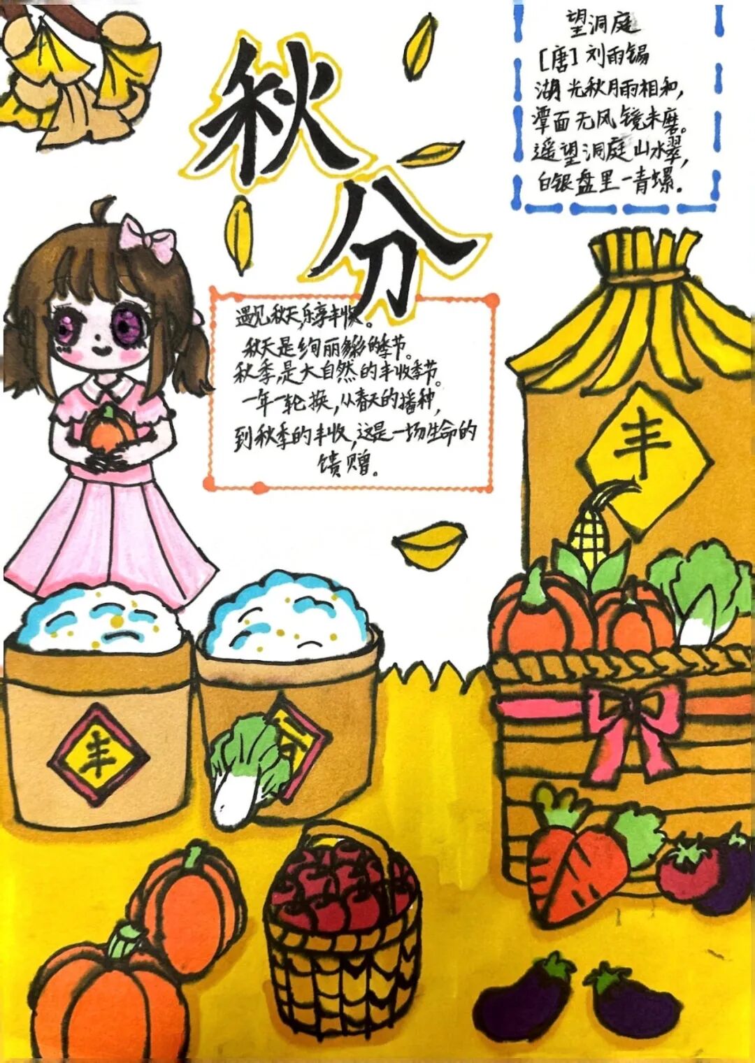 一、二、三年级小月芽用彩笔描绘丰收景象,四、五年级小月芽用彩笔设计丰收小报,共同捕捉秋天硕果累累的景象,歌颂百果成熟、大地飘香的丰收成果。