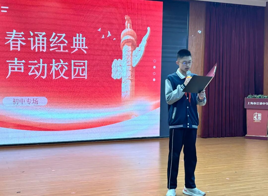 四月的春风携着书香,上海市江镇中学的校园里回荡着青春的铿锵之声。4月30日,“春诵经典 声动校园”校园朗诵活动(初中专场)在小剧场隆重举行。初中部的同学们以声传情、以诗言志,用经典篇章致敬中华文化,用青春之声点燃校园热情。本次活动由初一2班宋轩锐同学主持。