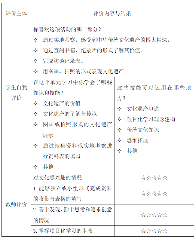 2.学生通过参与实践活动,培养出熟练运用语文学习工具来搜集、整理、处理信息的能力,填写文化遗产候选项目资料表以及访谈记录表,在实践中形成主动探究、团结合作、勇于创新的精神: